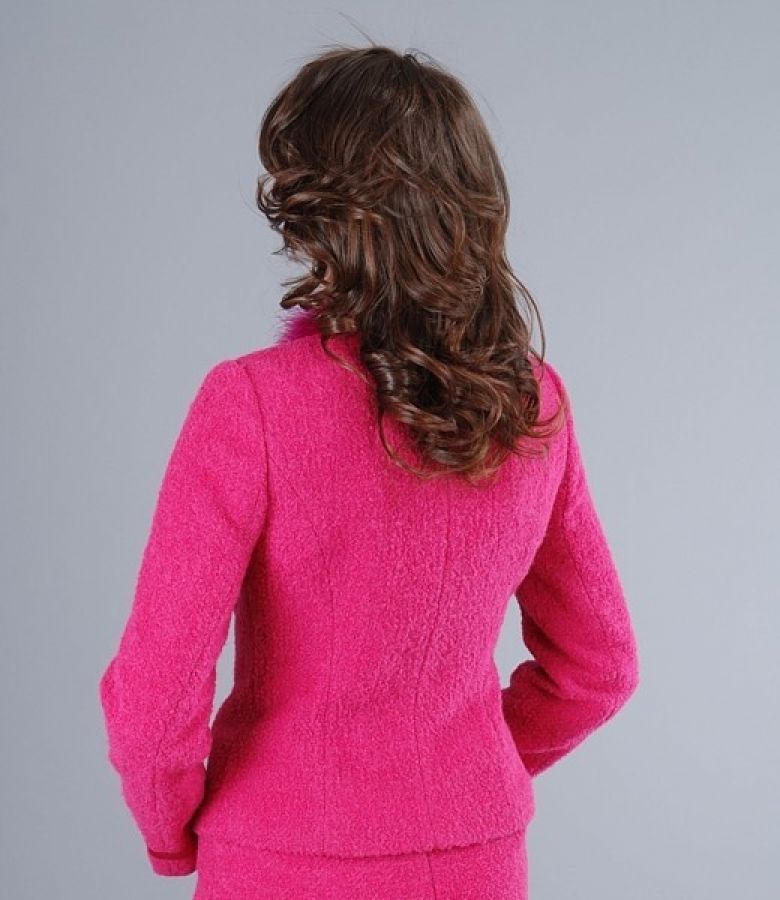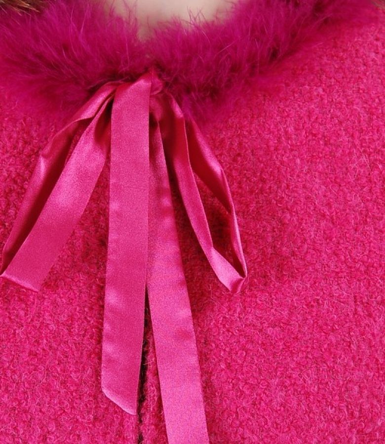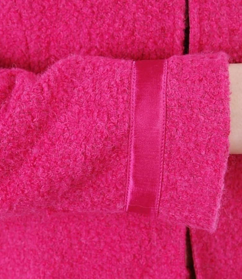 Wool and alpaca cyclamen loops jacket without collar and lapels. Feather and satin lining in tone, fixed on neckline and satin lining in tone at sleeves termination . Closes on the front with 5 eyelets hooks to the cleavage. Tightens the bow at the neckline.