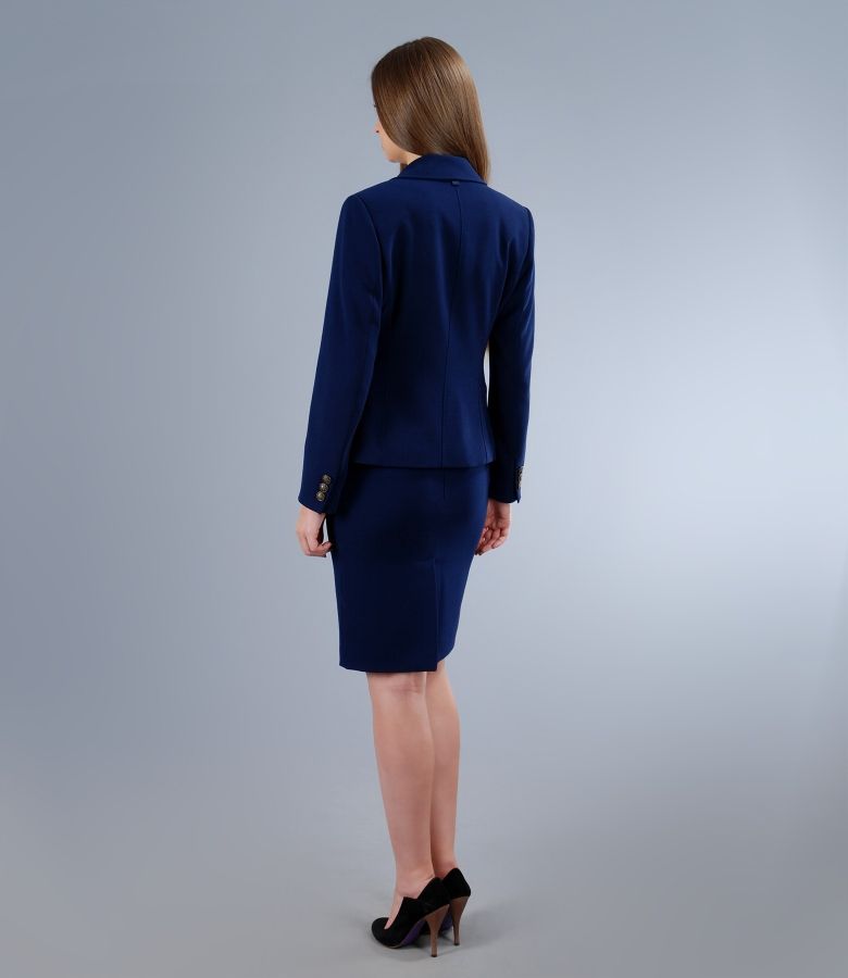 Office jacket from elastic fabric, with square collar and lapels and deep V-neck. Long sleeves with false slit closed with 3 buttons and 2 side pockets. Closes in front with one button
