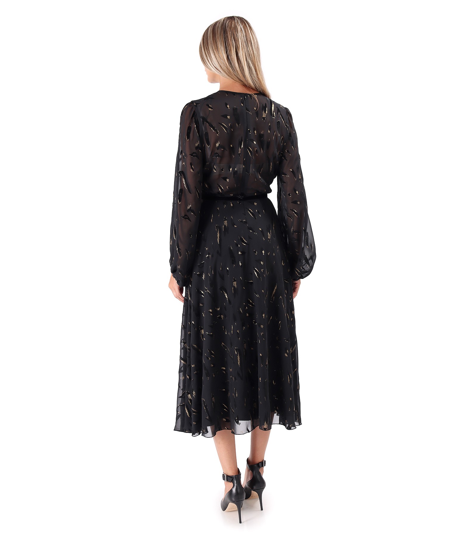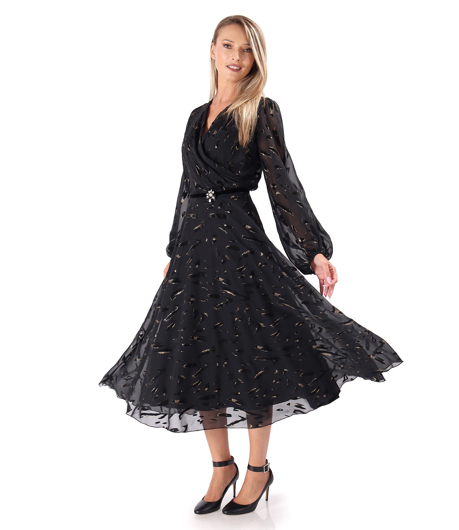 Midi dress in voile with raised velvet patterns and gold accents, featuring a velvet belt with a detachable brooch at the waist, lined with viscose, with a wrap-over bodice, and long, wide sleeves gathered at the cuffs. It fastens with a concealed zipper at the center back.