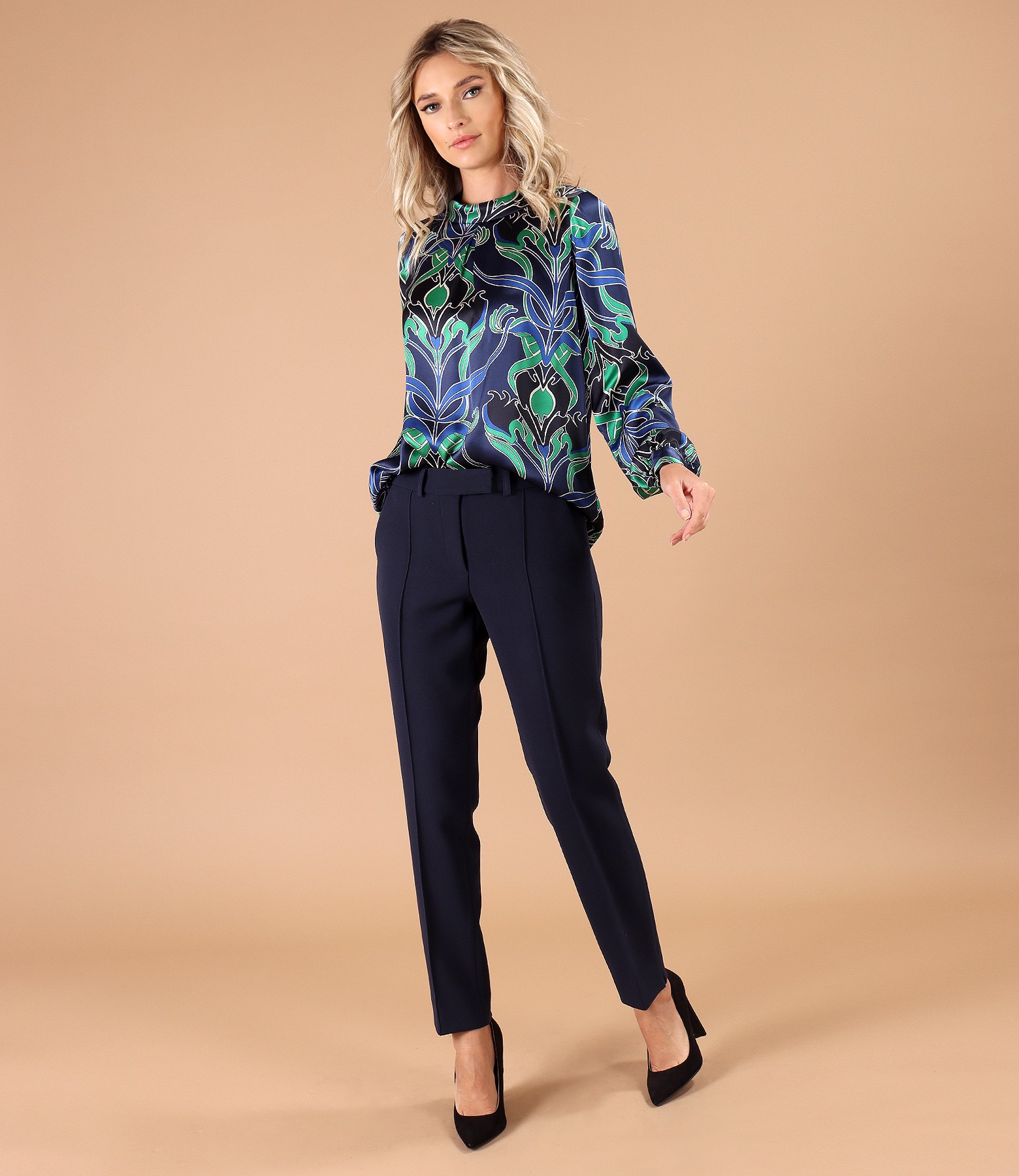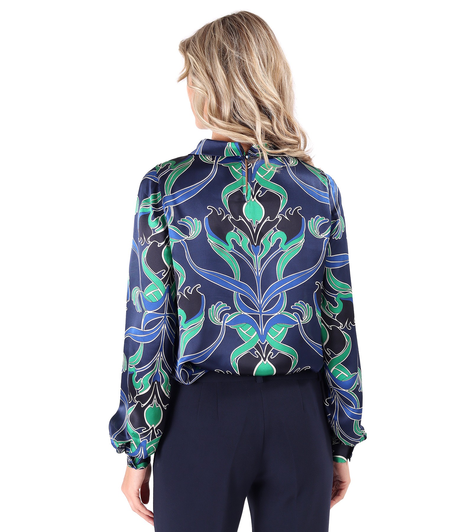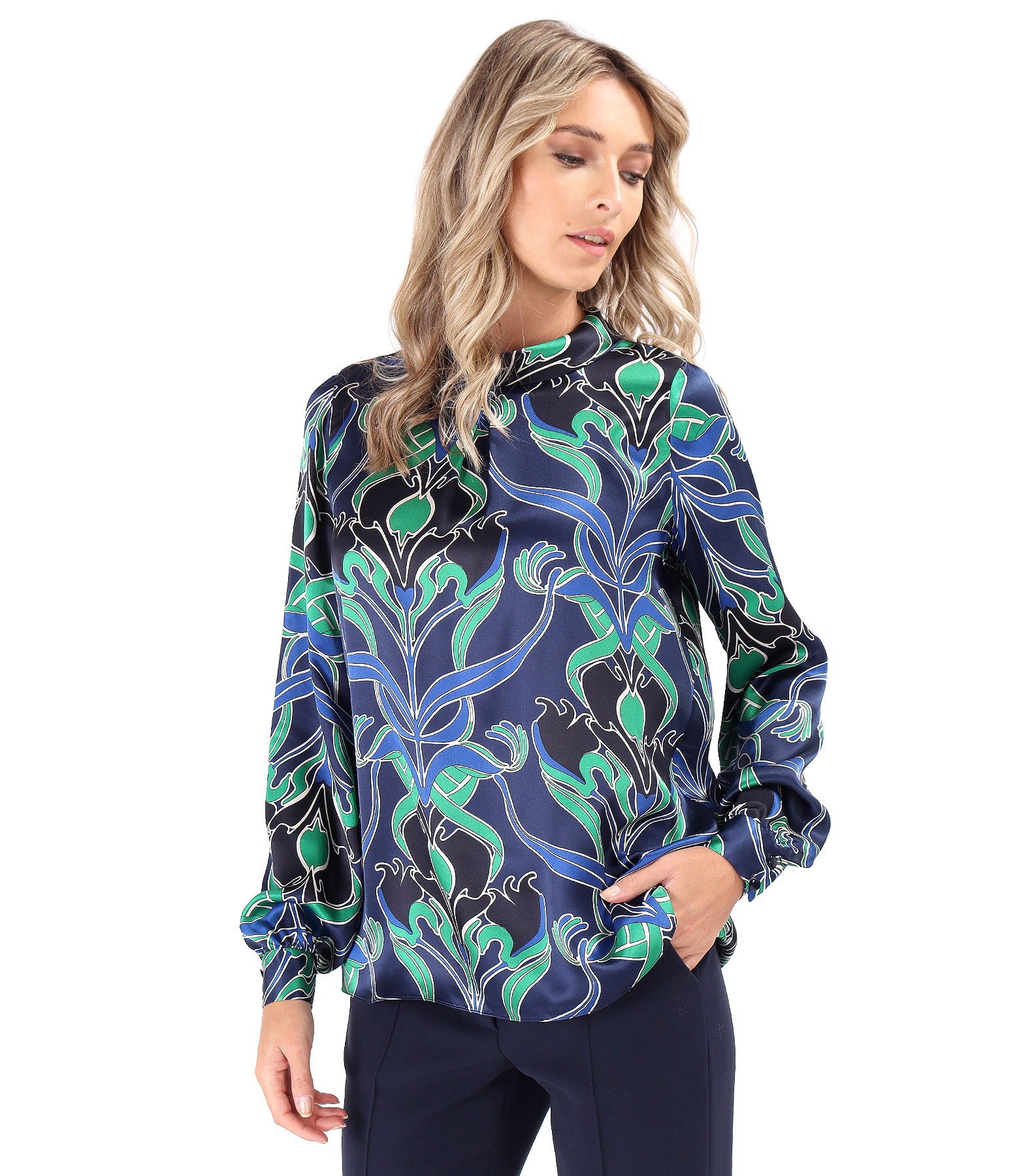 Natural silk blouse printed with floral motifs, long ruffled sleeves with cuffs of the same material with 2 buttons, with a pleat in the middle of the front and a round neckline. It closes with a button on the middle back.