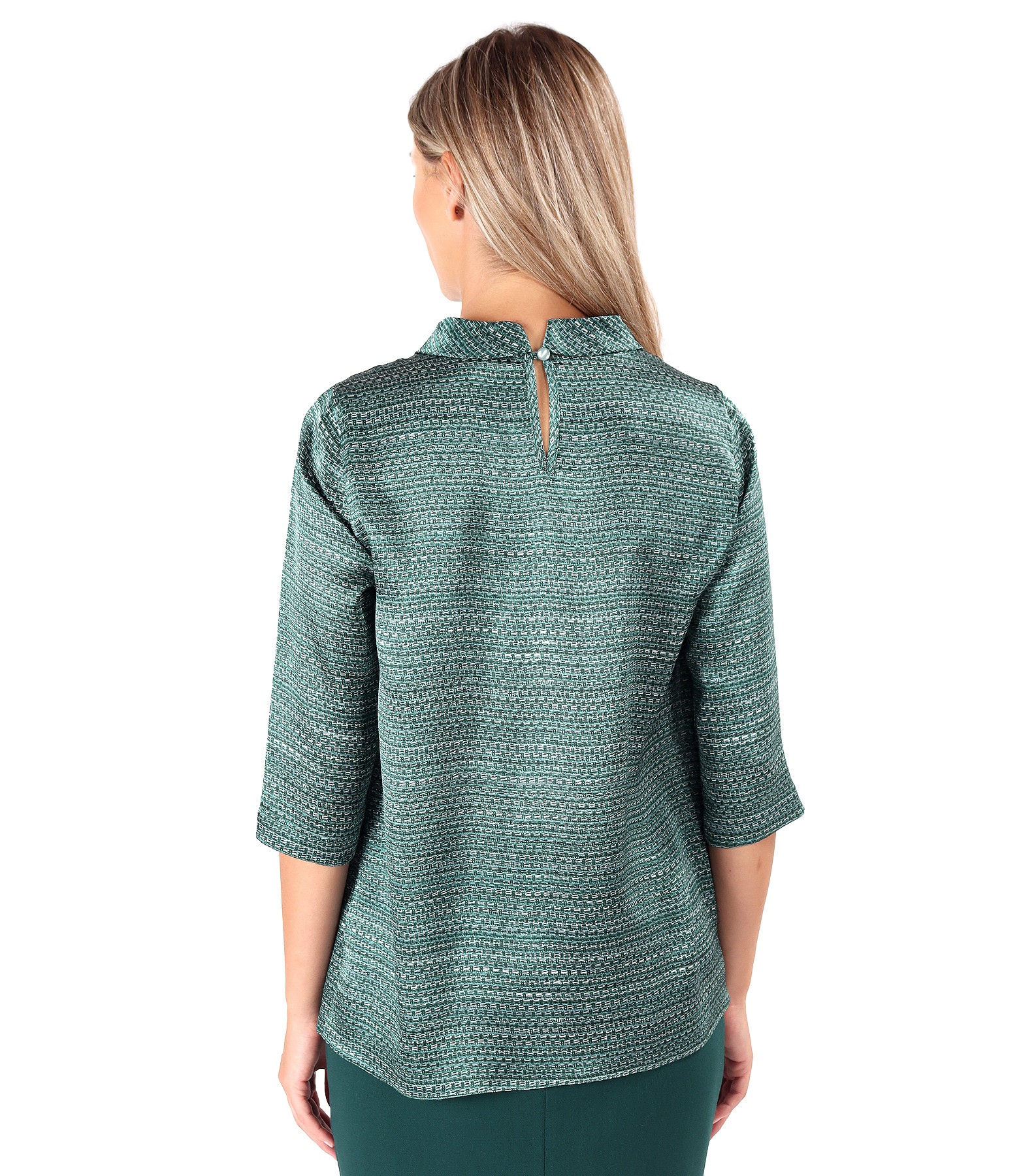 Natural silk blouse printed with geometric motifs, 3/4 sleeves, with fold in the middle of the front and round neckline. It closes with a button on the middle back.