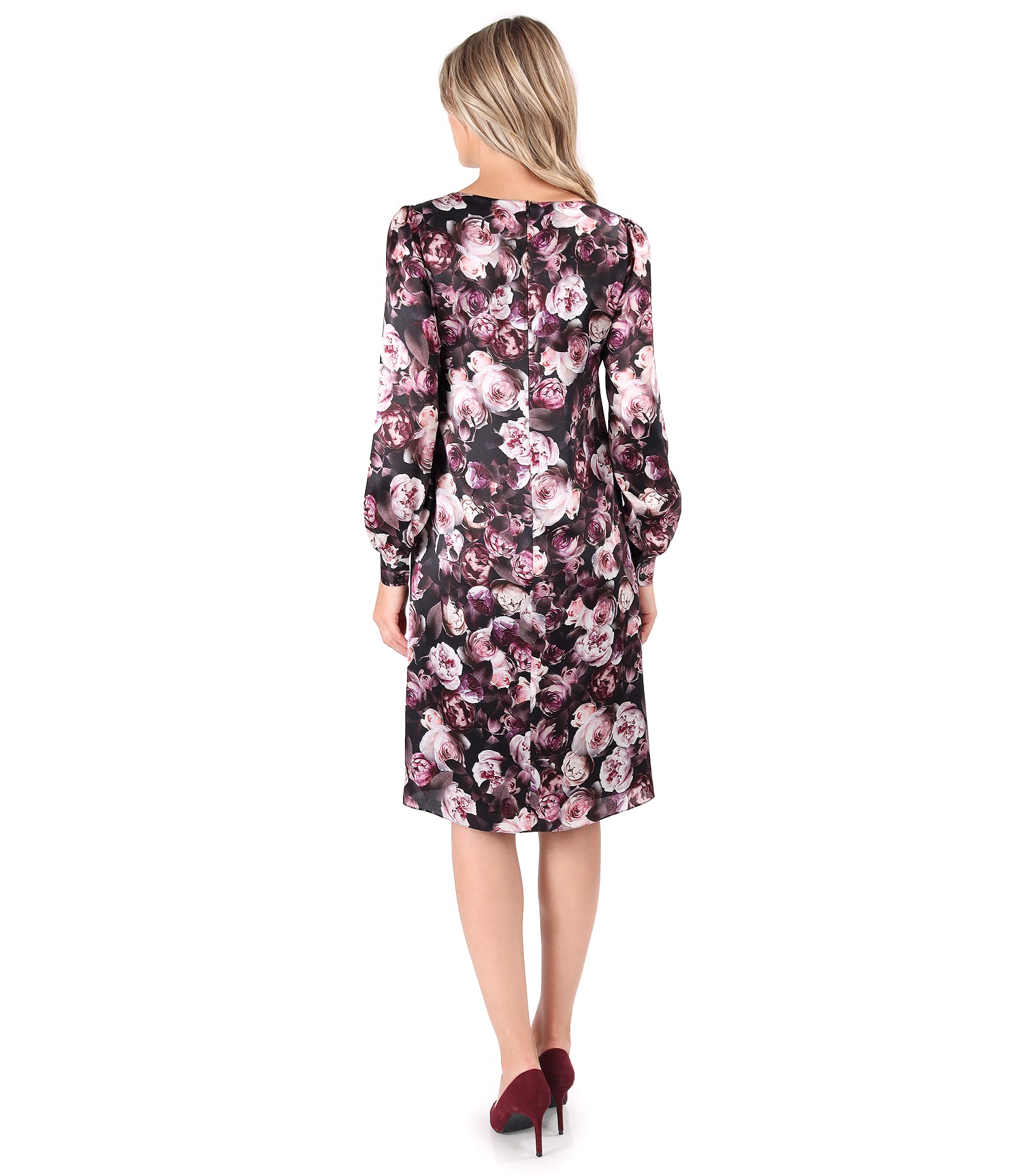 Natural silk dress, digitally printed with floral motifs. The dress is padded with viscose, has long sleeves, ruffled cuffs of the same material with 2 buttons, and a round neckline. It closes with a zipper in the middle of the back.
