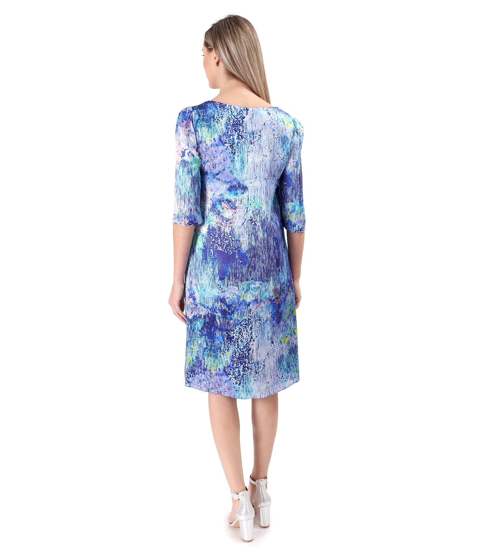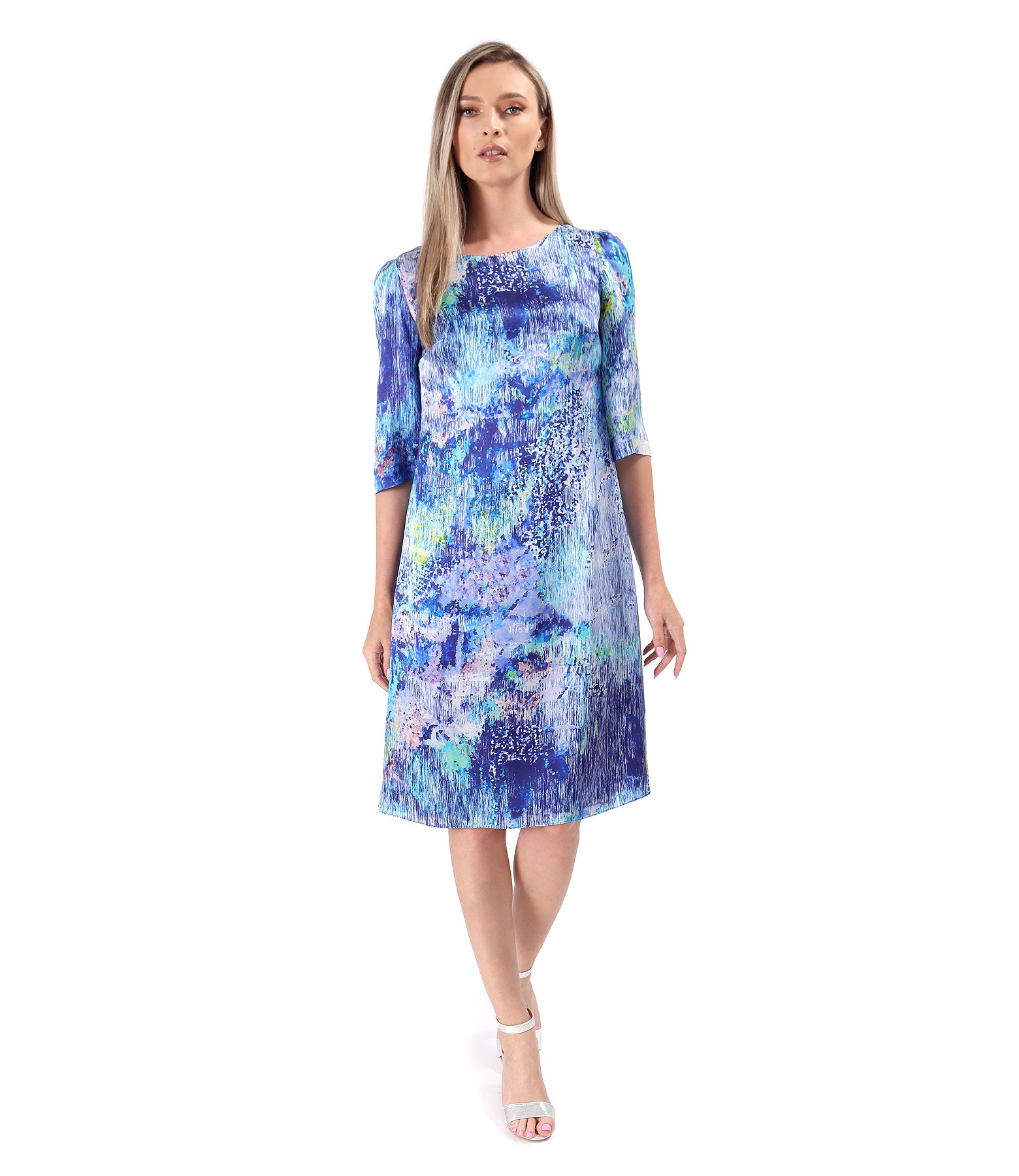 Digitally printed natural silk dress. The dress is doubled with viscose, has 3/4 sleeves, and a round neckline. It closes with a hidden zipper in the middle of the back.