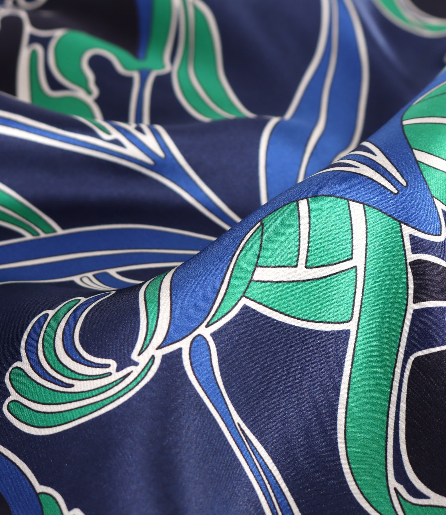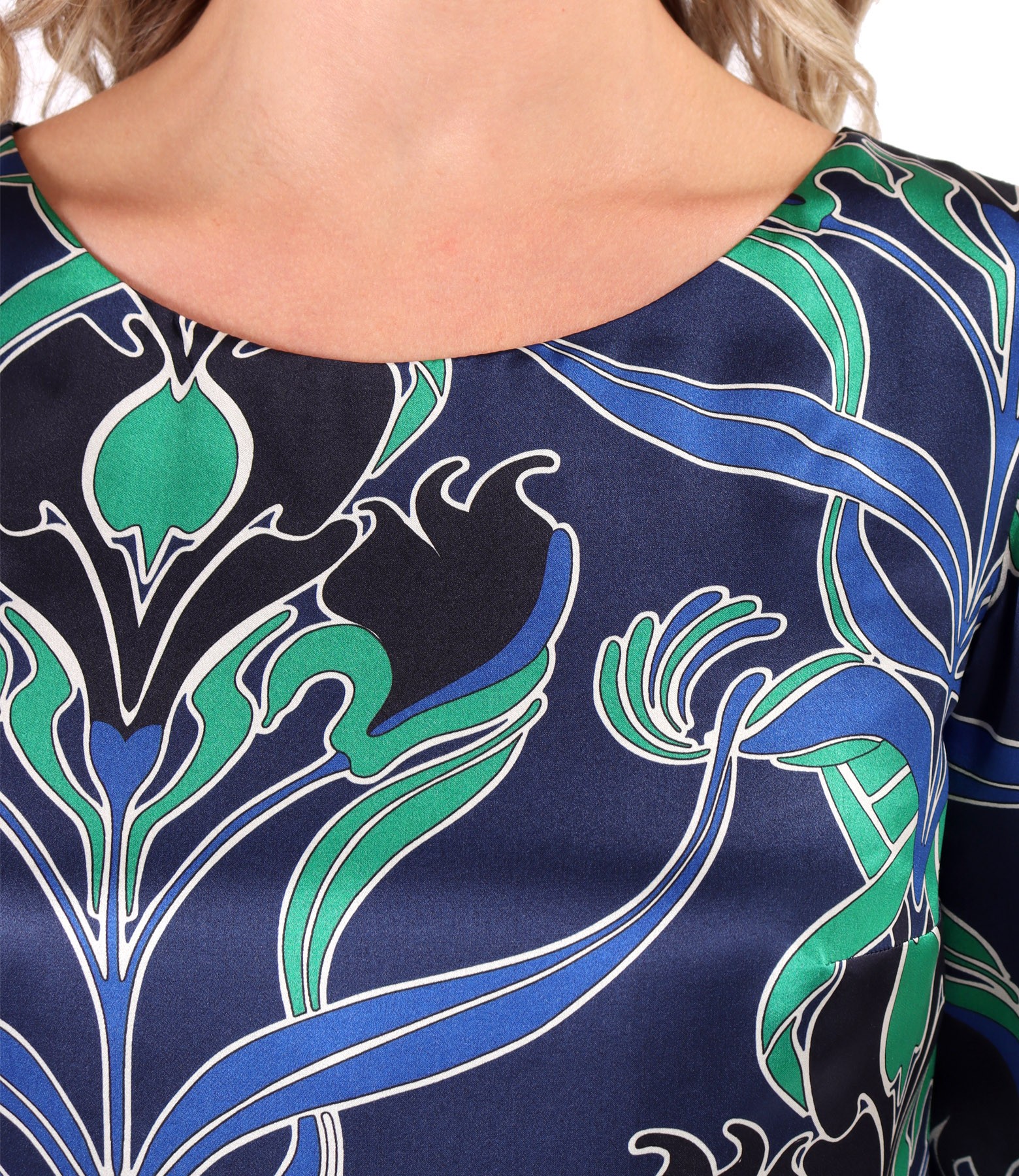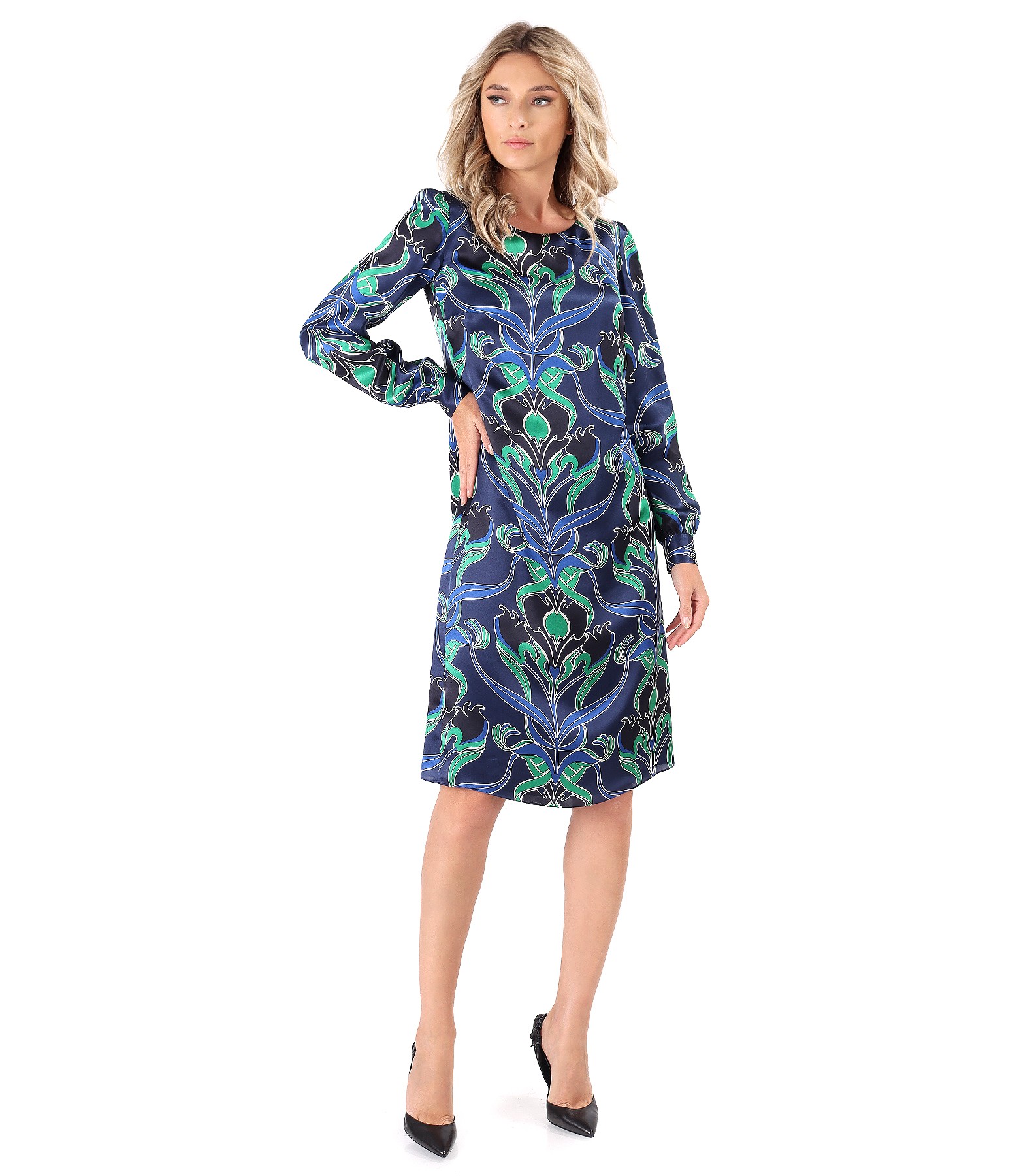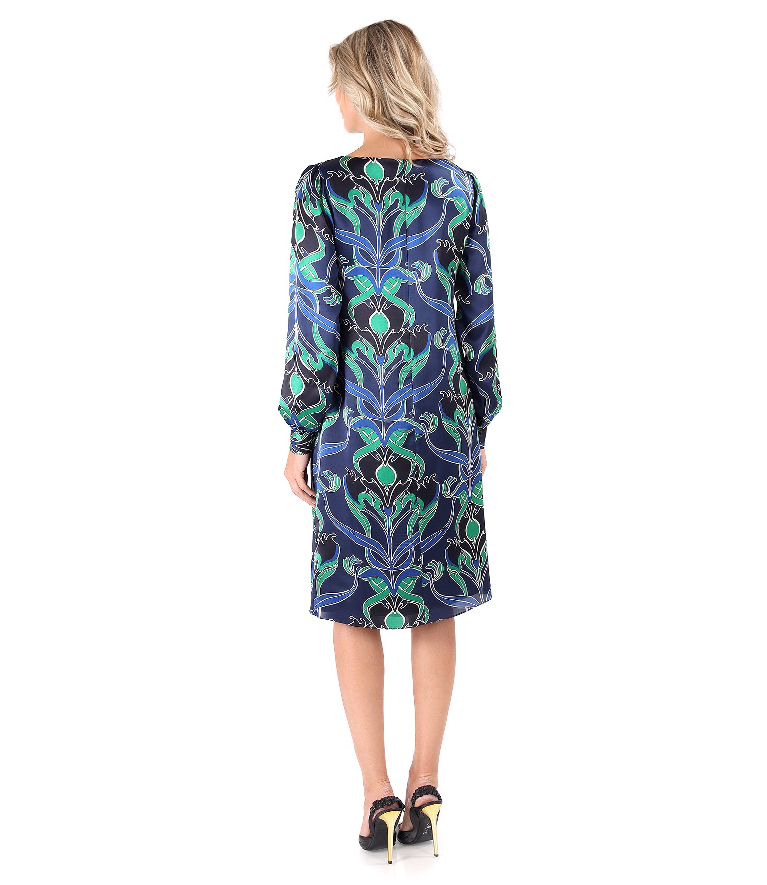 Natural silk dress, digitally printed with floral motifs. The dress is doubled with viscose and has long sleeves with ruffled cuffs of the same material with 2 buttons and a round neckline. It closes with a zipper in the middle of the back.