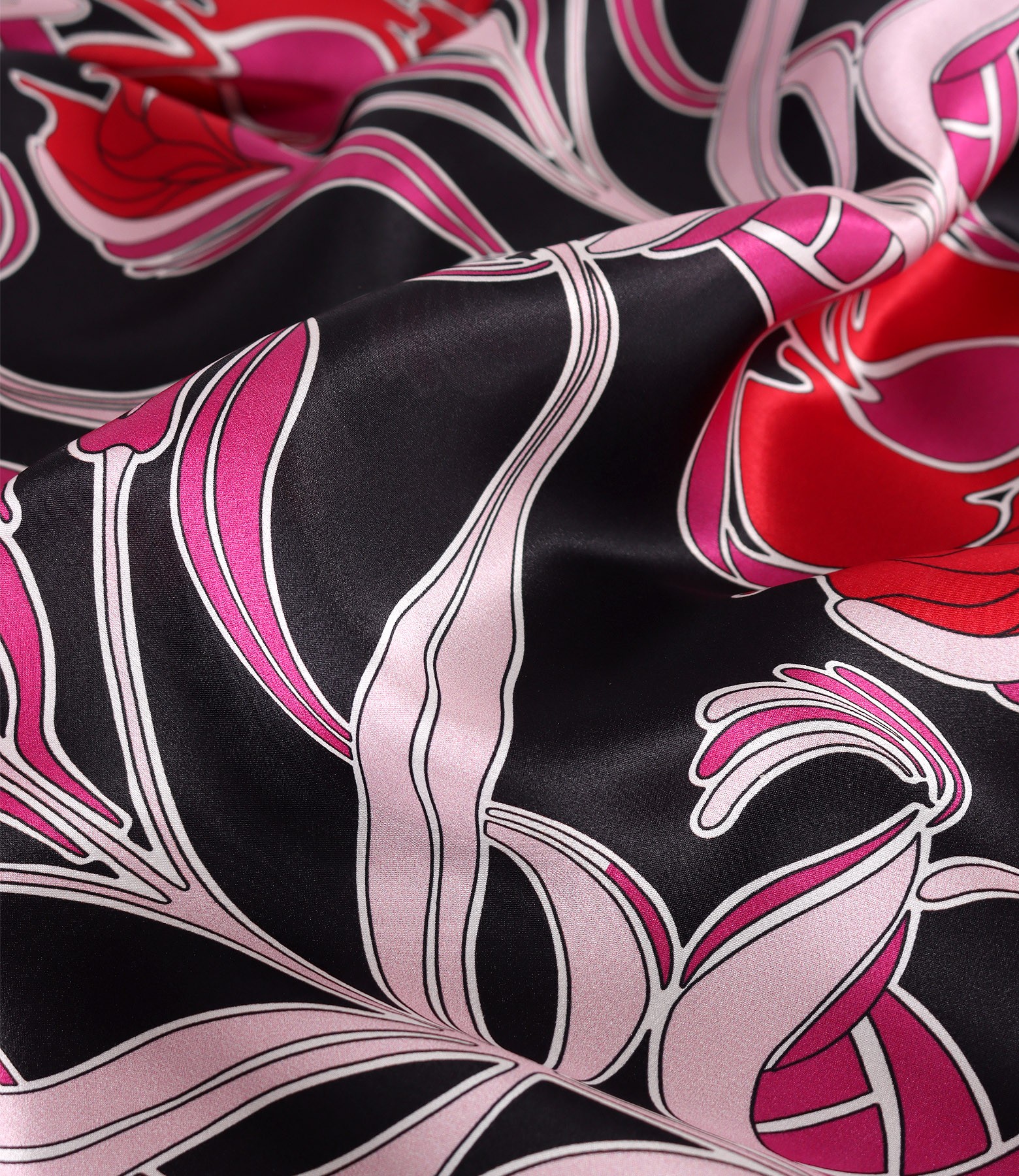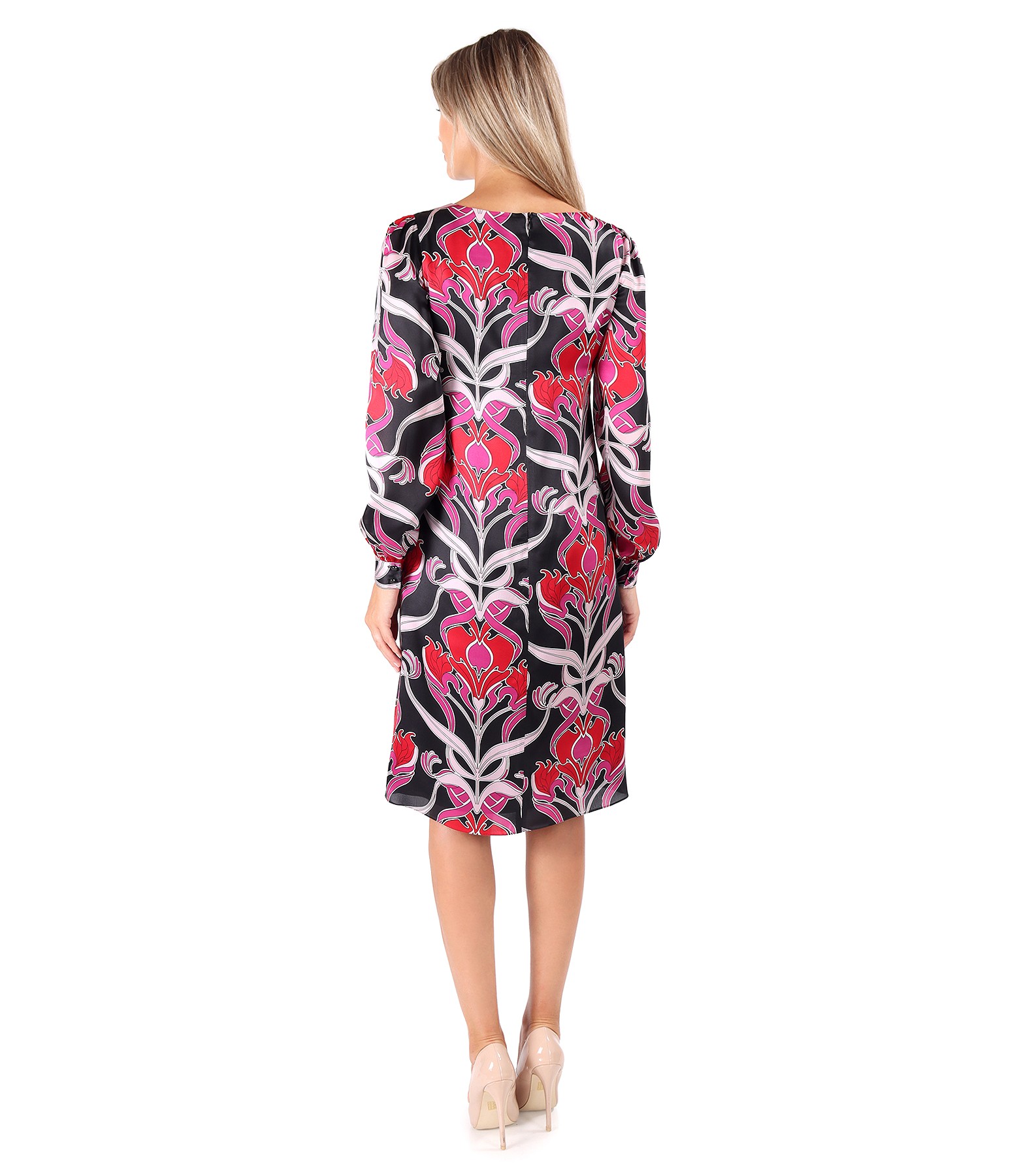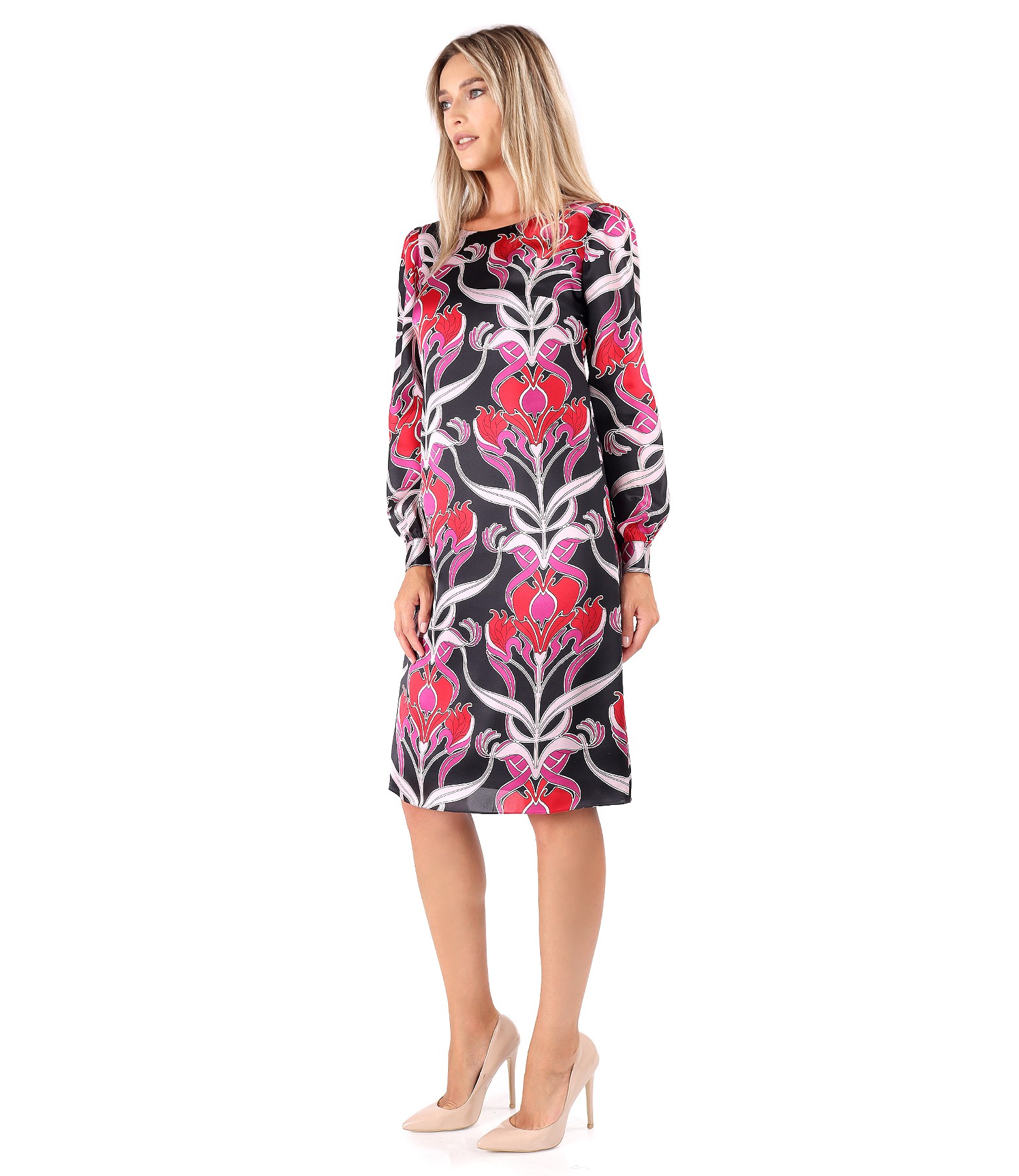Natural silk dress, digitally printed with floral motifs. The dress is doubled with viscose and has long sleeves with ruffled cuffs of the same material with 2 buttons and a round neckline. It closes with a zipper in the middle of the back.