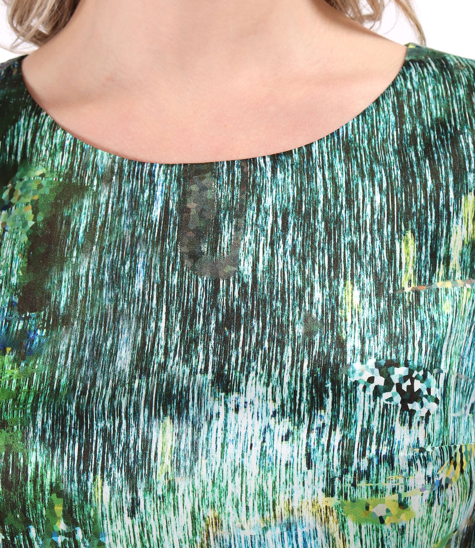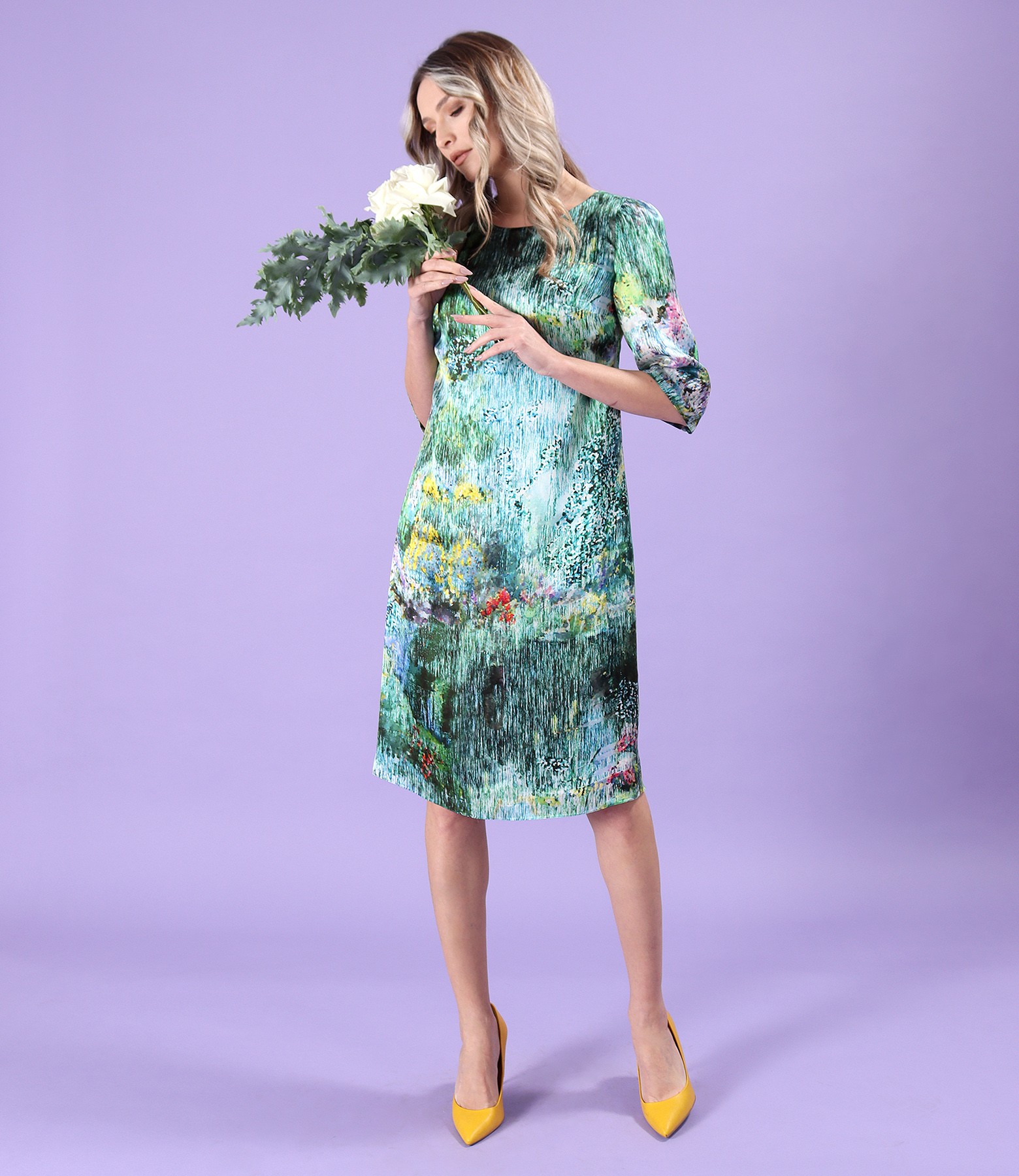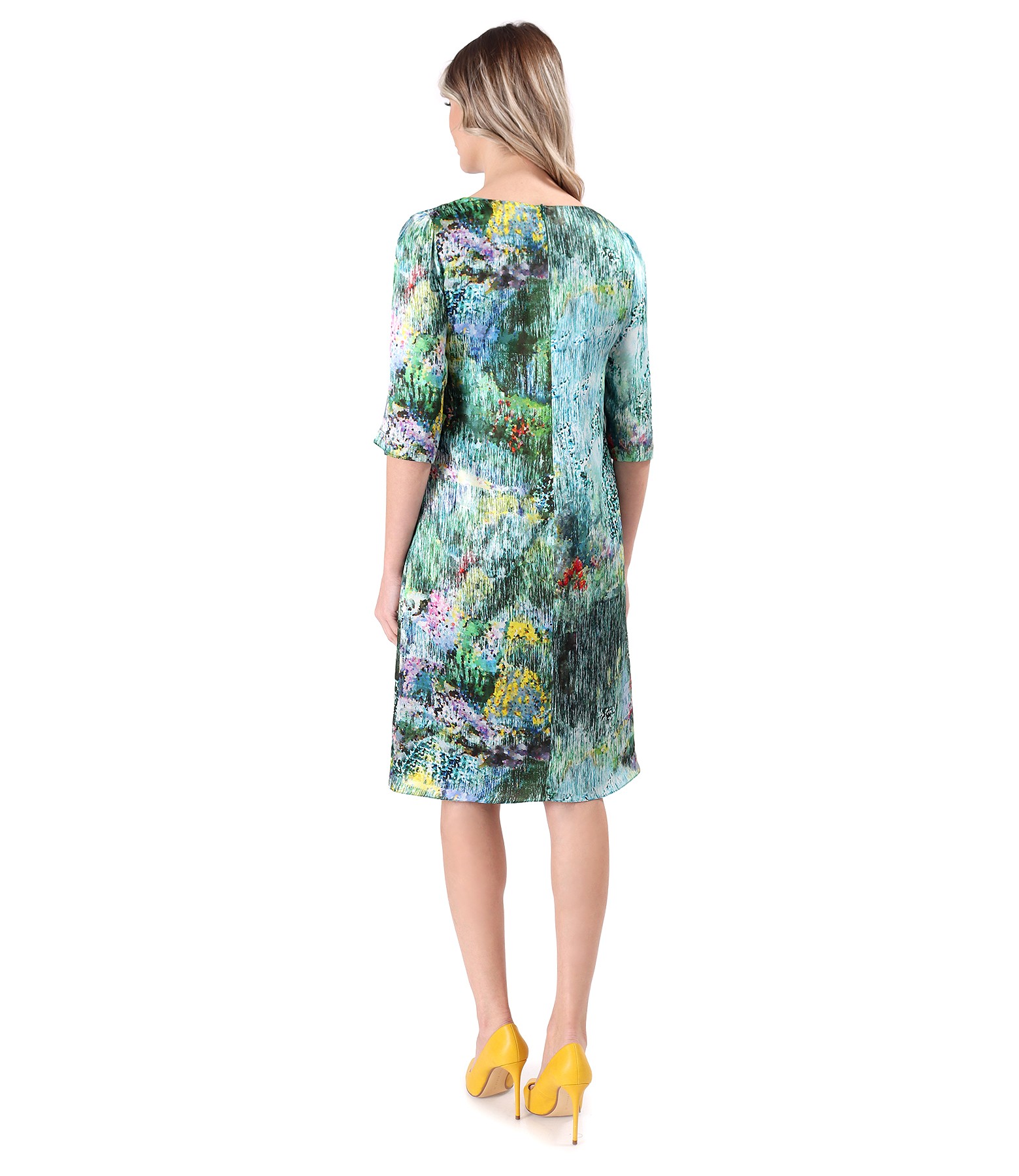 Digitally printed natural silk dress. The dress is doubled with viscose, has 3/4 sleeves, and a round neckline. It closes with a hidden zipper in the middle of the back.