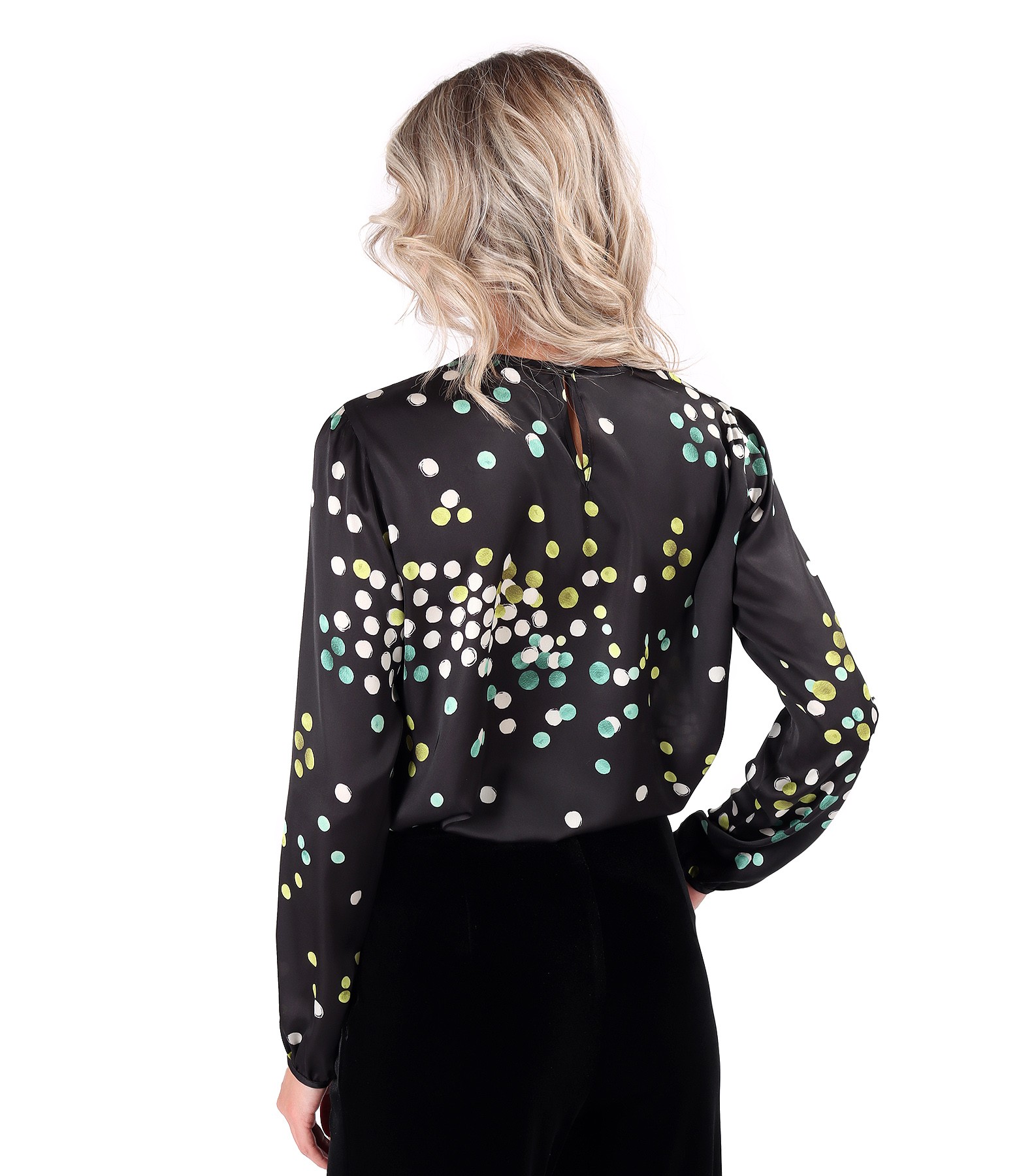 Digitally printed satin blouse with colored polka dots, with long sleeves gathered at the end and a round neckline with a pleat in the middle of the front. It closes with a button on the middle back.