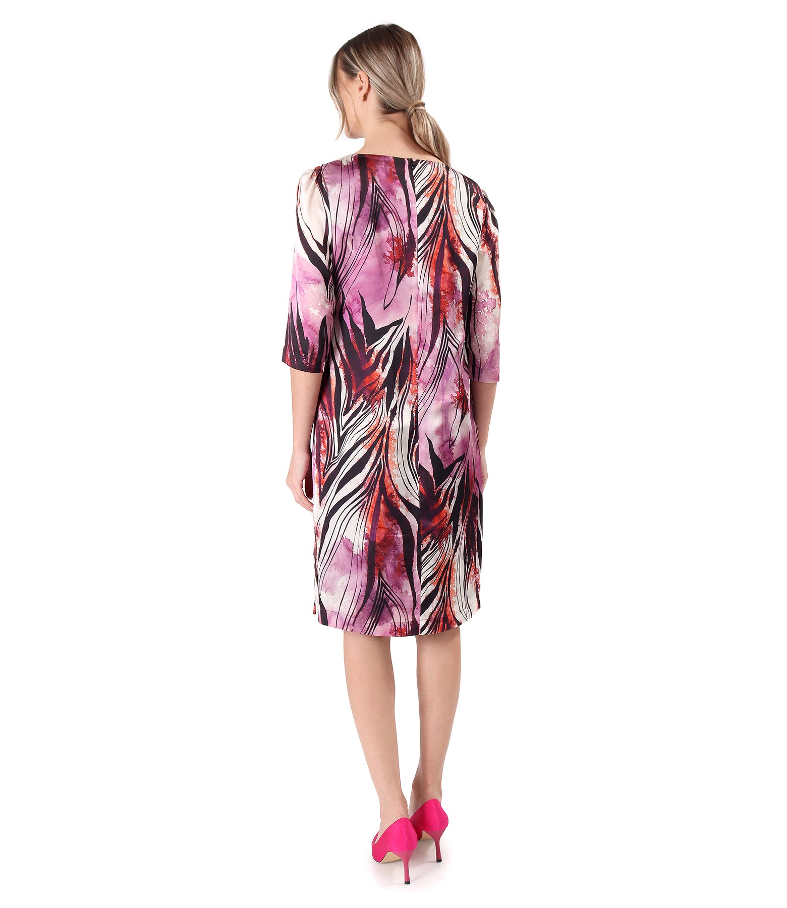 Digitally printed satin dress with floral motifs, padded with viscose, with 3/4 sleeves and round neckline. It closes with a zipper in the middle of the back. The position of the print varies per product.