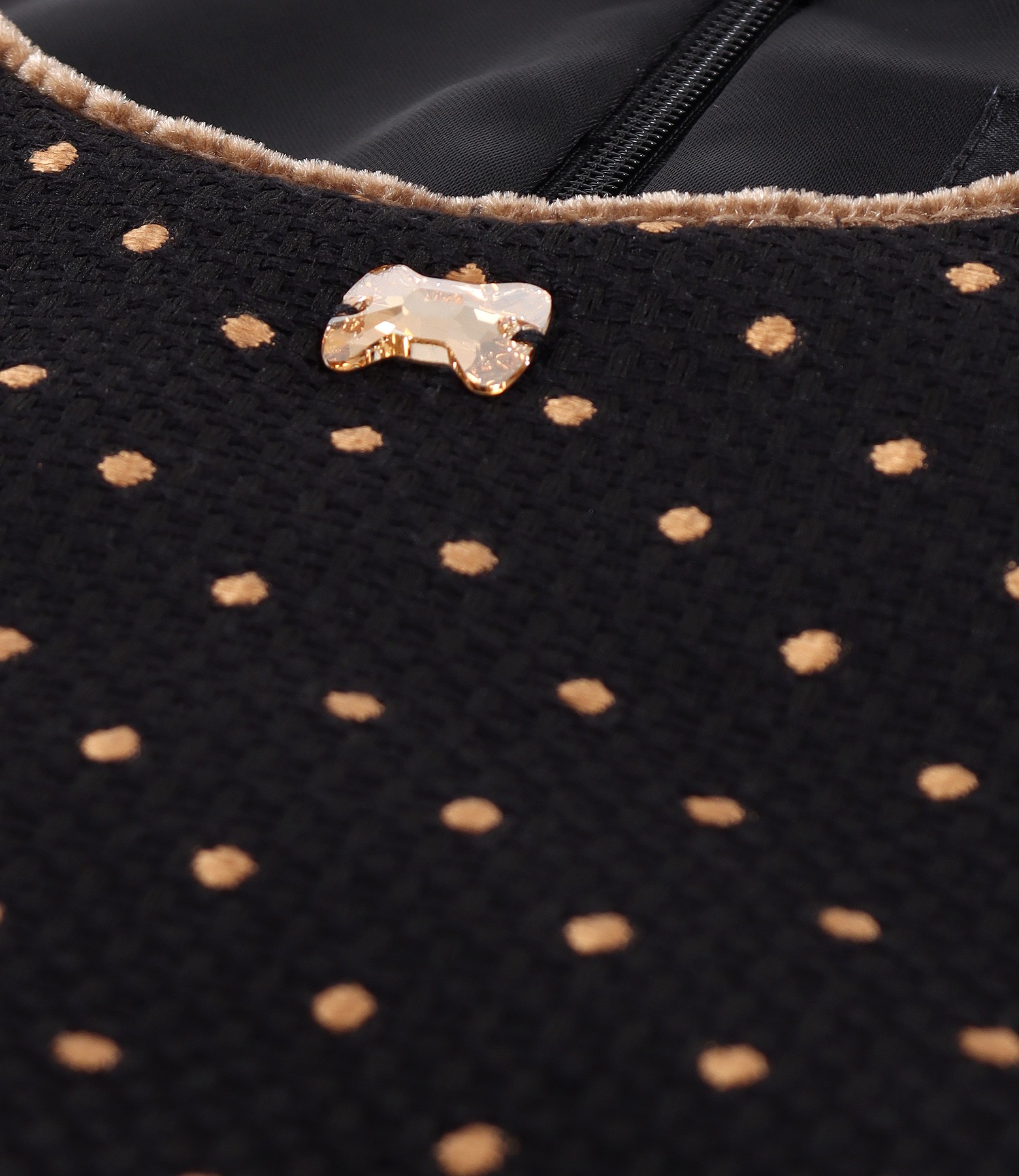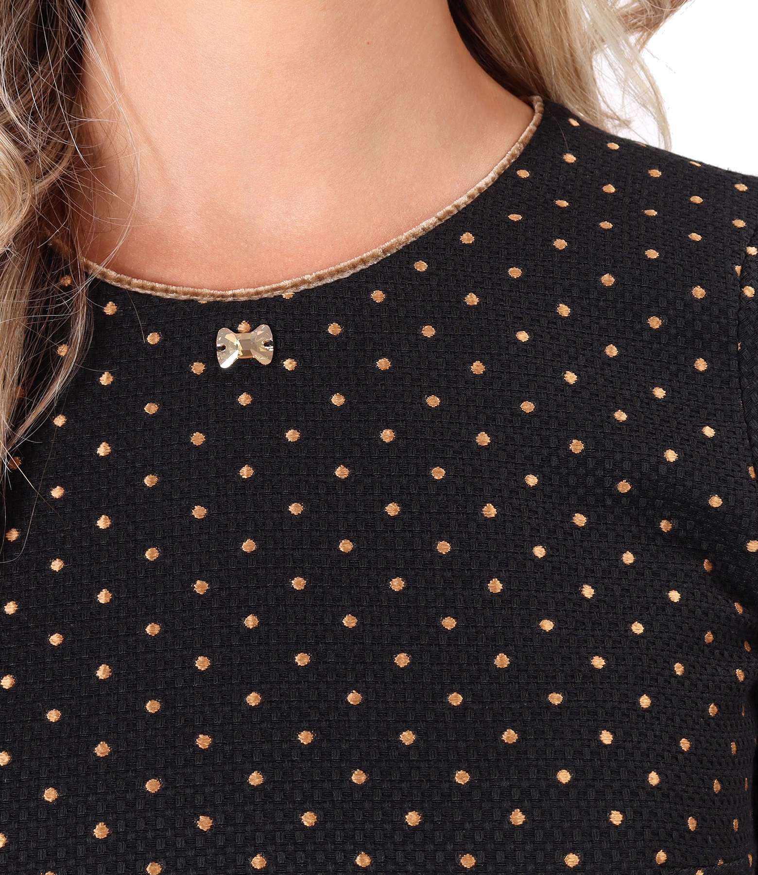 Dress made of cotton, unlined, with 3/4 sleeves, round collar with velvet lining, embellished with crystals. Closes with a zipper hidden in the middle of the back.