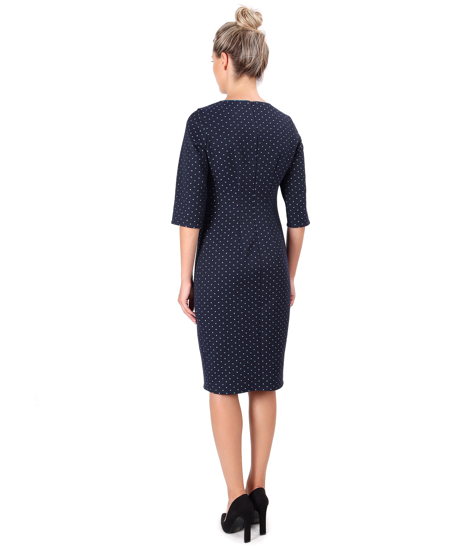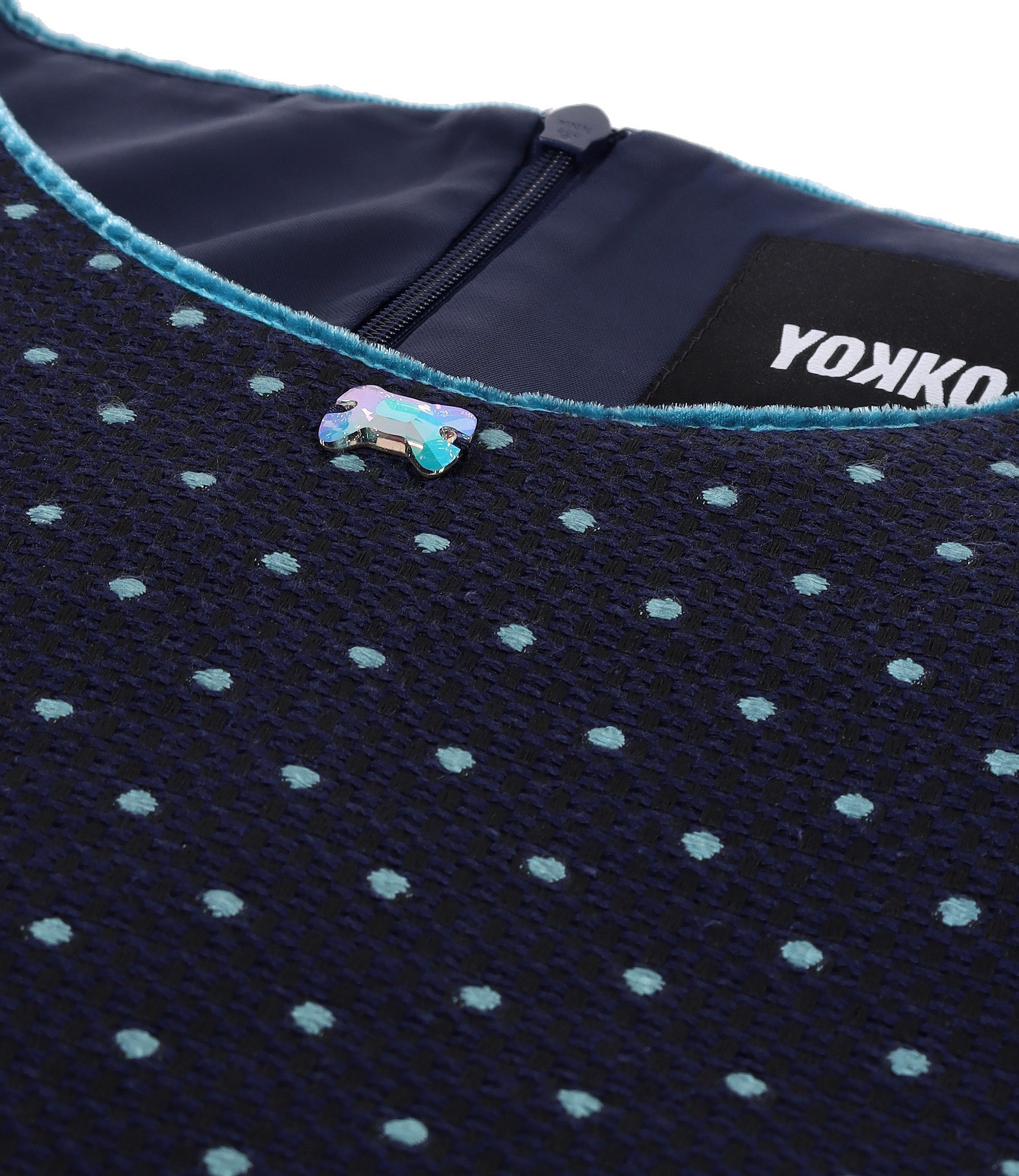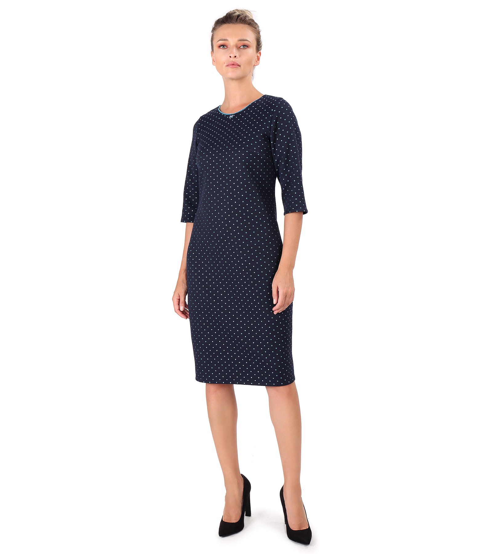 Dress made of cotton, unlined, with 3/4 sleeves, round collar with velvet lining, embellished with crystals. Closes with a zipper hidden in the middle of the back.
