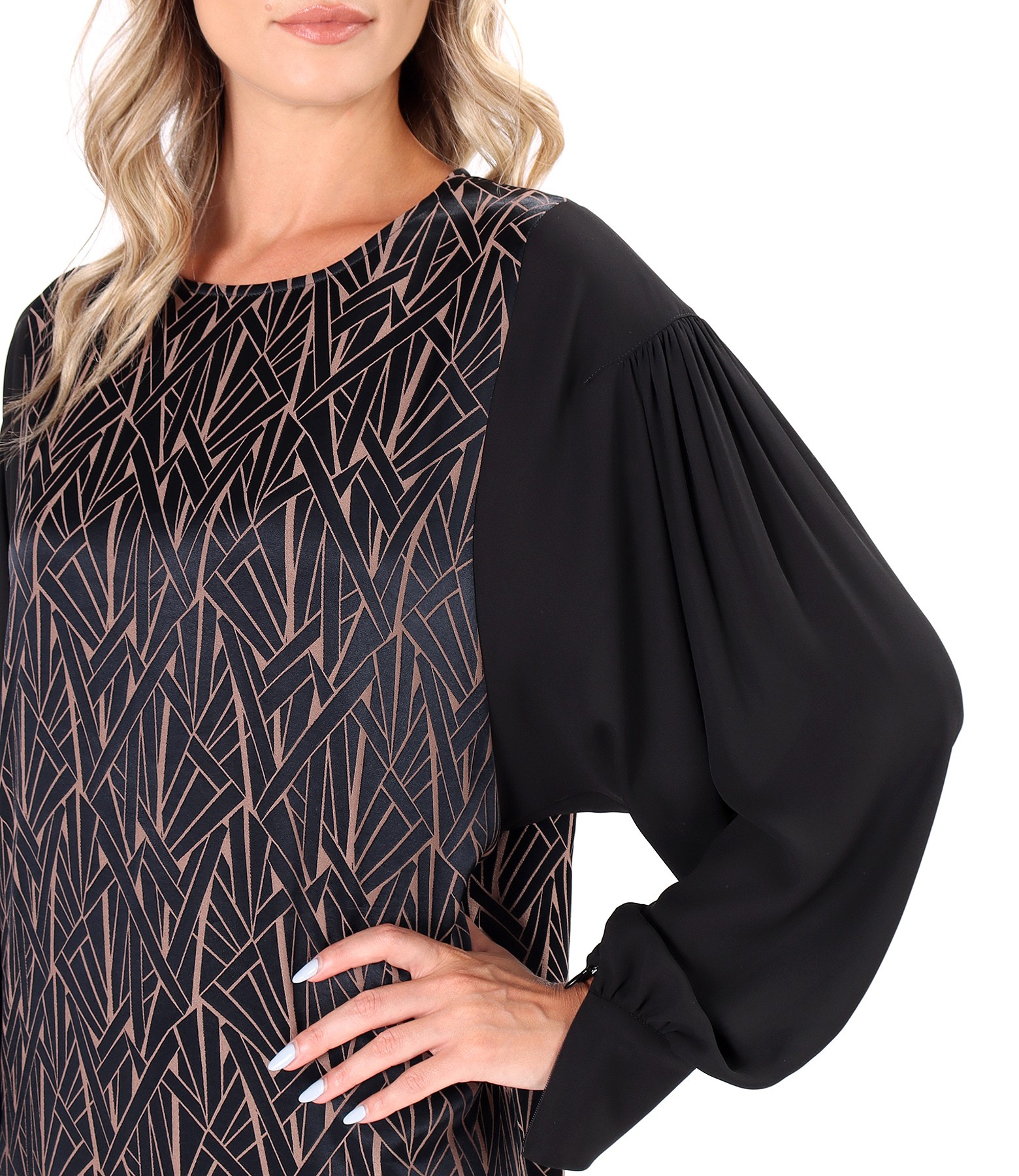 Dress made of elastic viscose fabric, printed with geometric motifs, with long sleeves and round neckline. It closes with a zipper in the middle of the back.