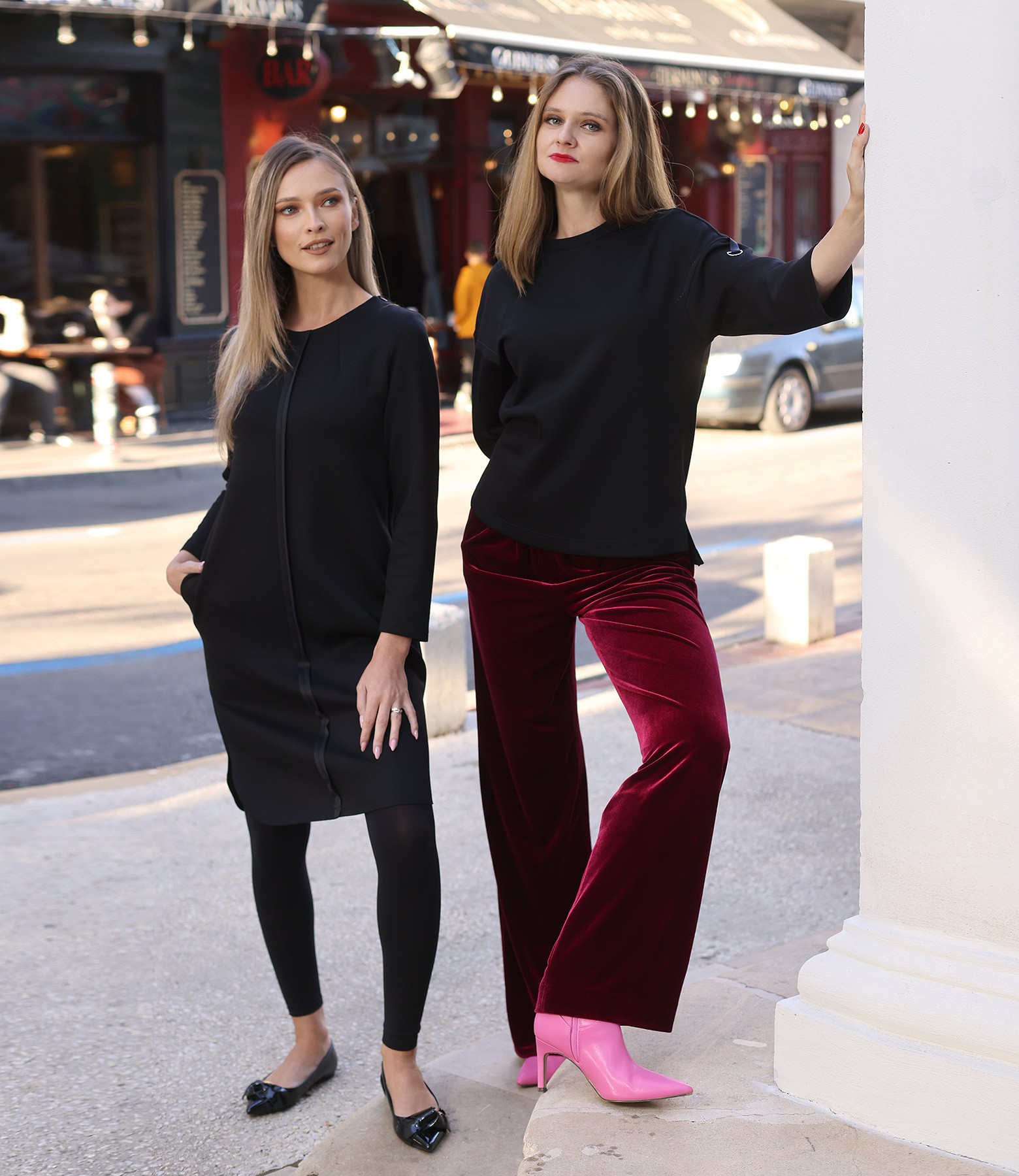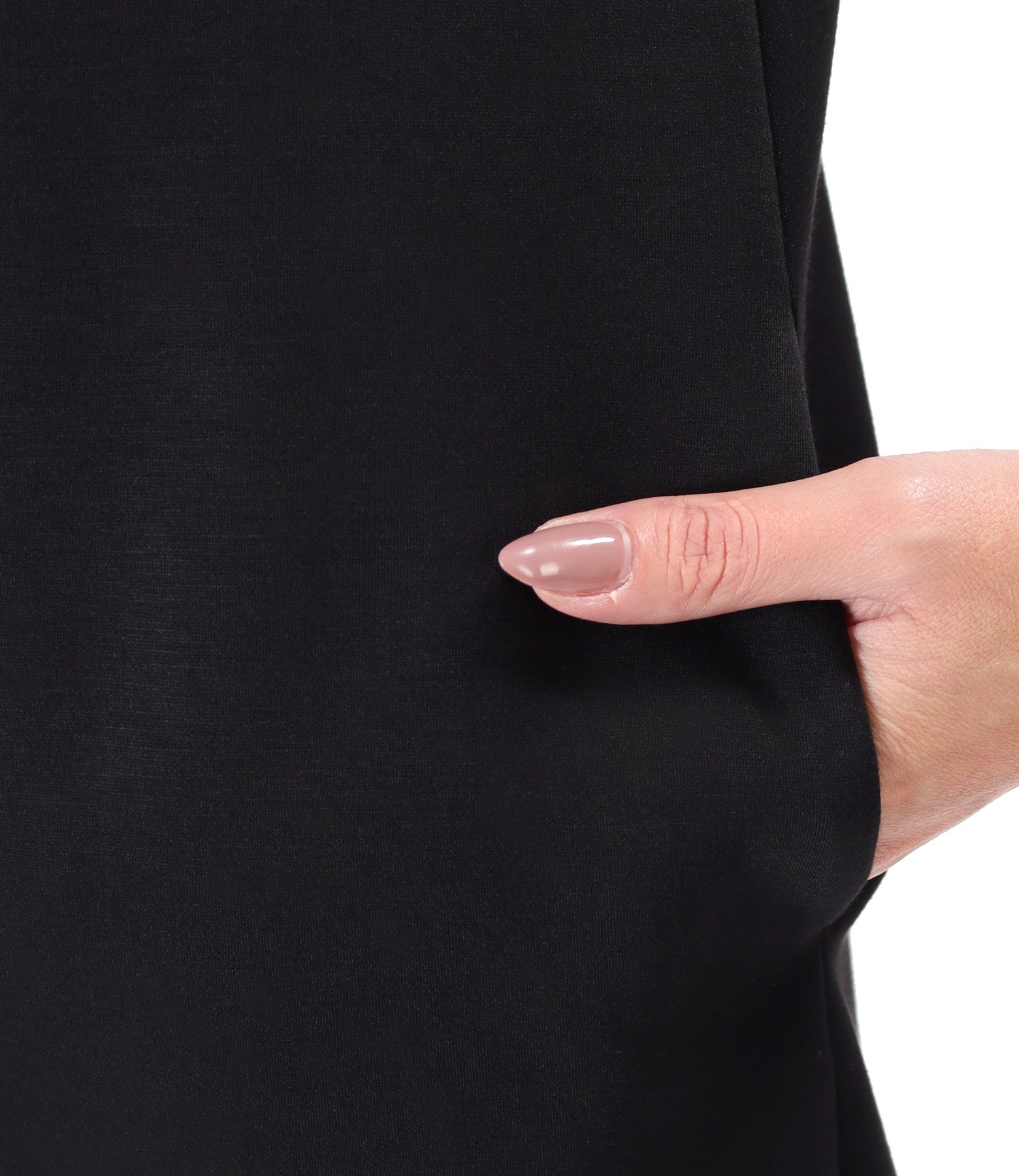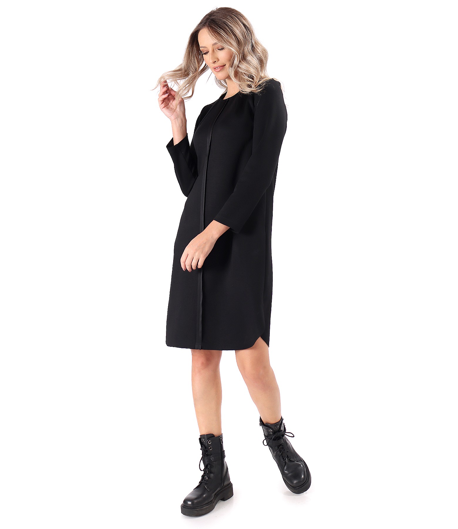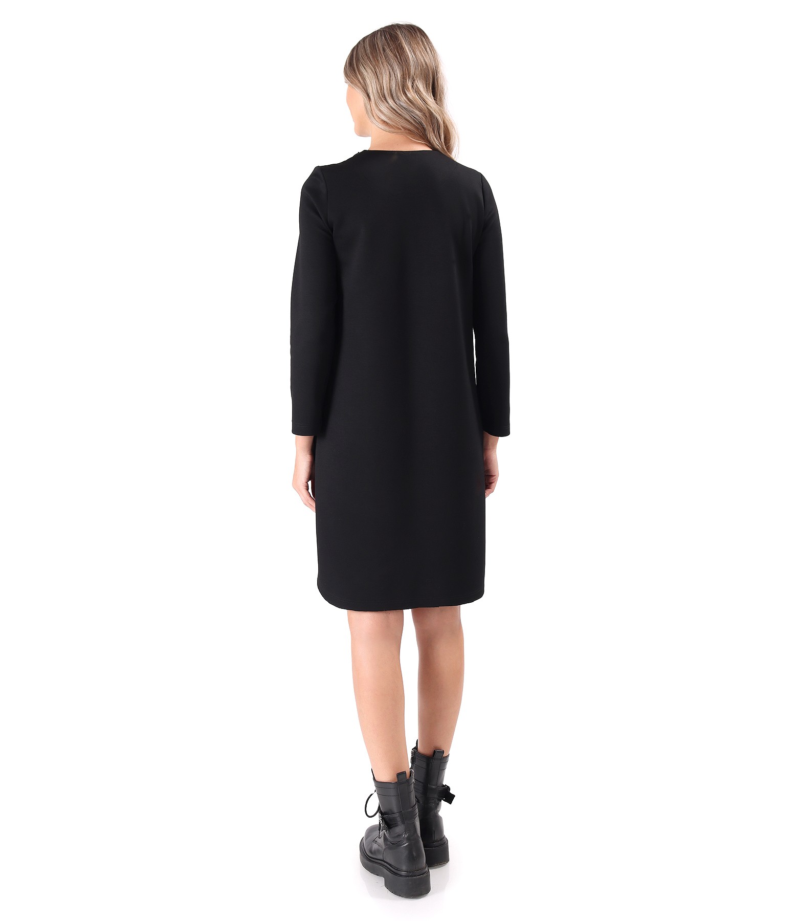 Dress made of scuba with viscose with zippers on the shoulders, round neckline, side slits, and long sleeves. The dress has a decorative seam in the middle of the front and side pockets.