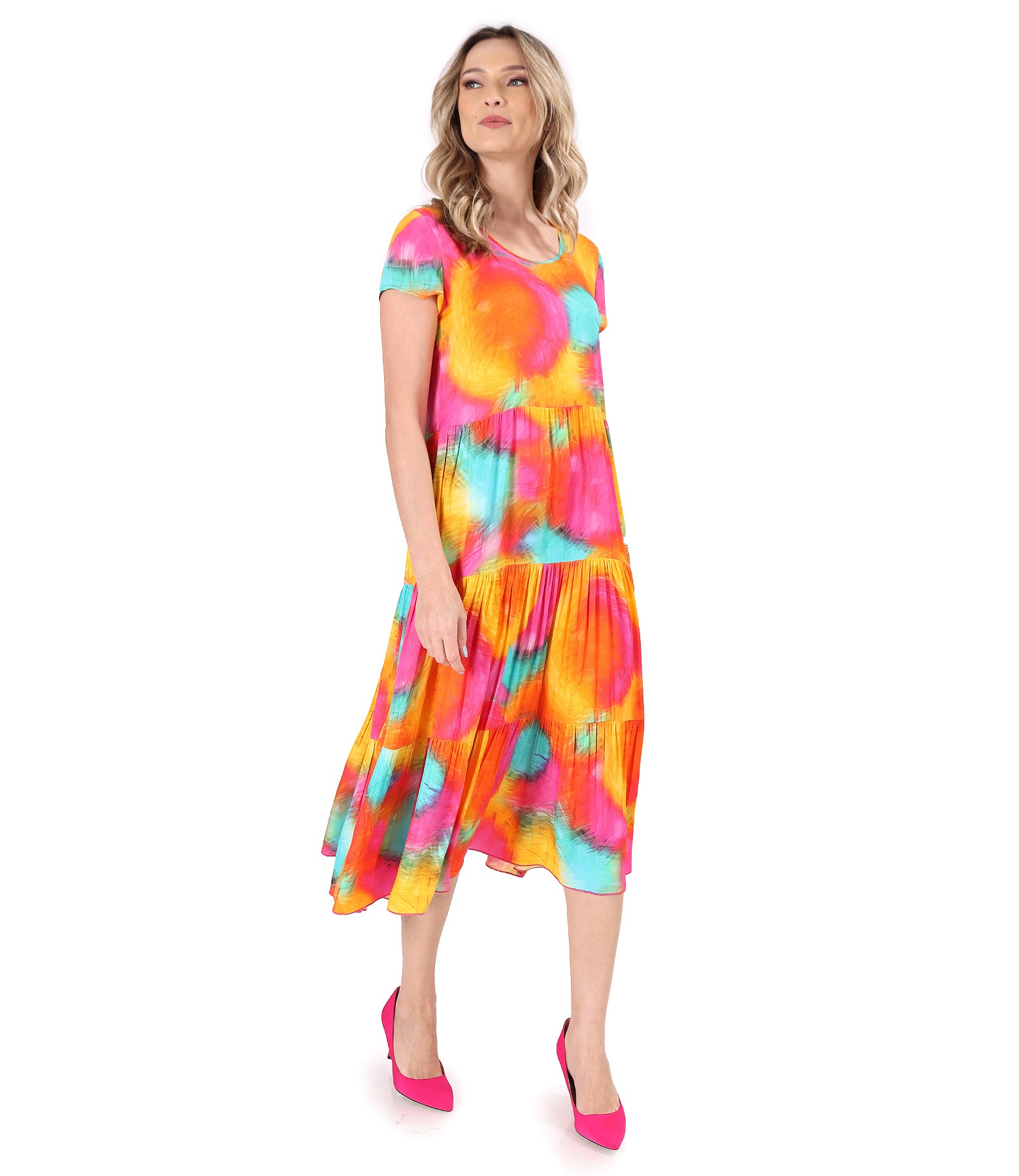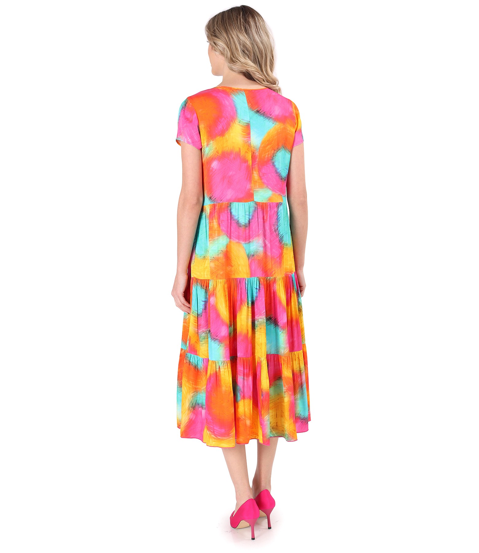 Dress with ruffles made of digitally printed viscose (Coral red), size