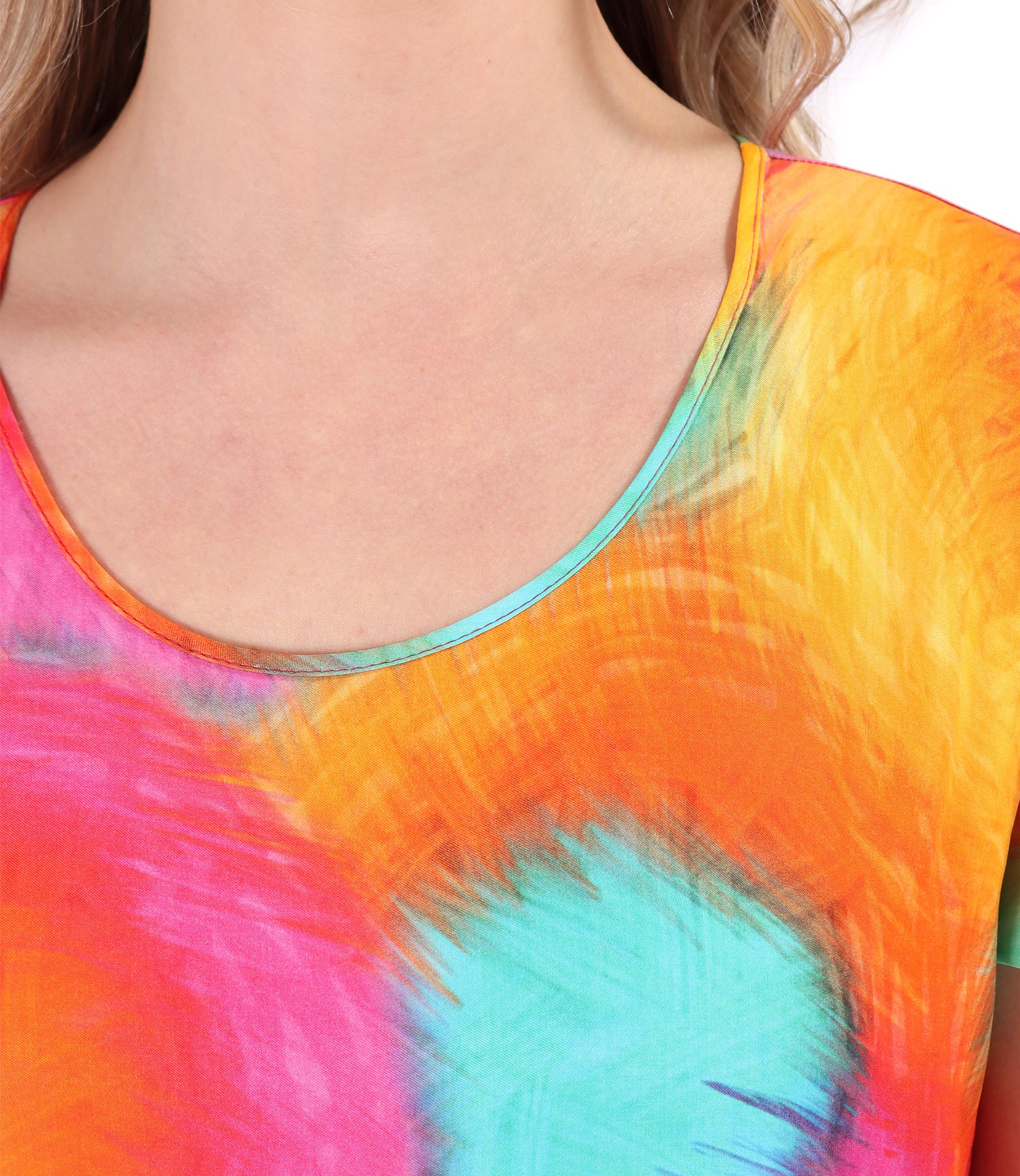 Dress with ruffles made of digitally printed viscose, with short sleeves, side pockets, and a round neckline. It has no closure system. The position of the print varies per product.