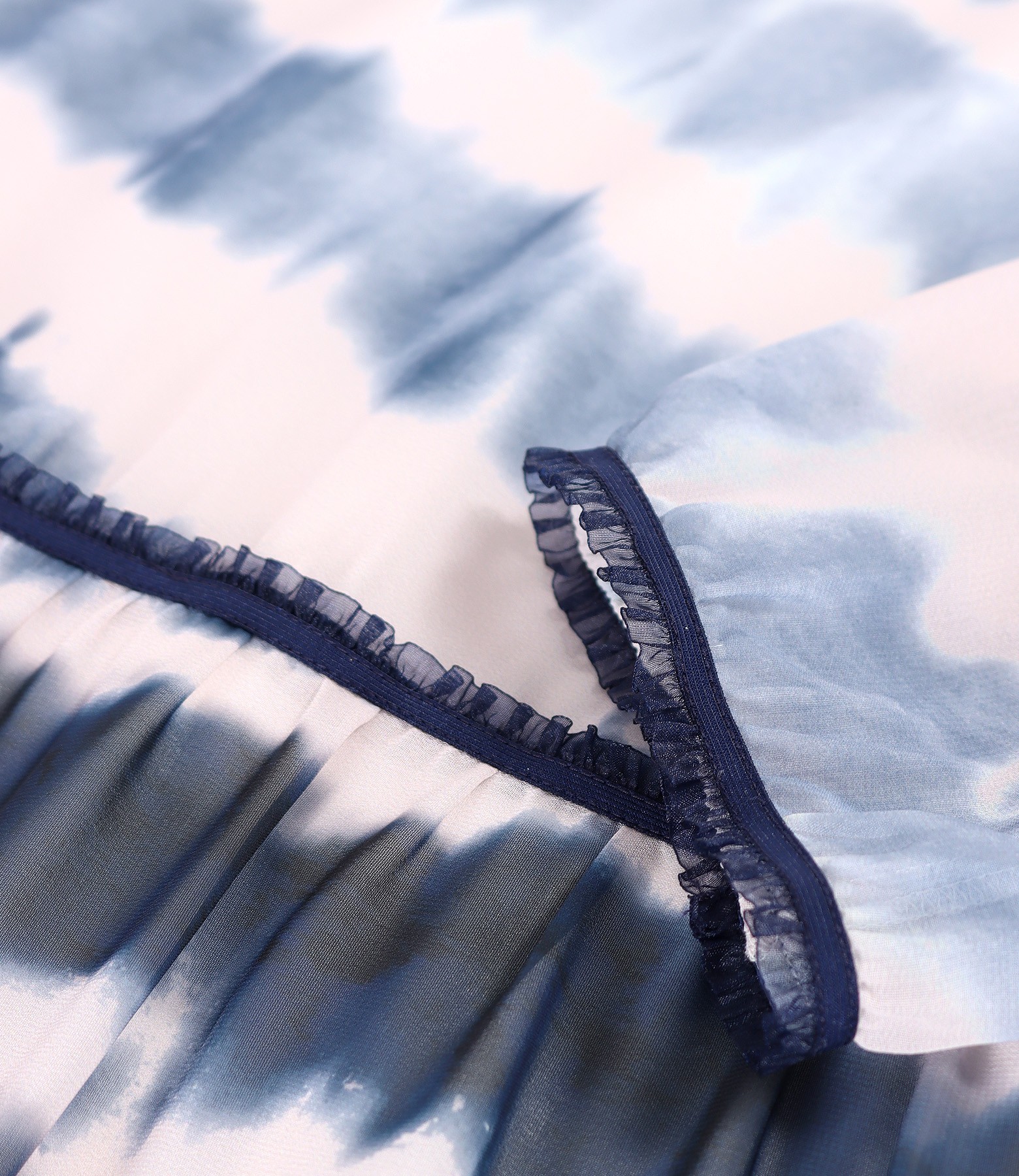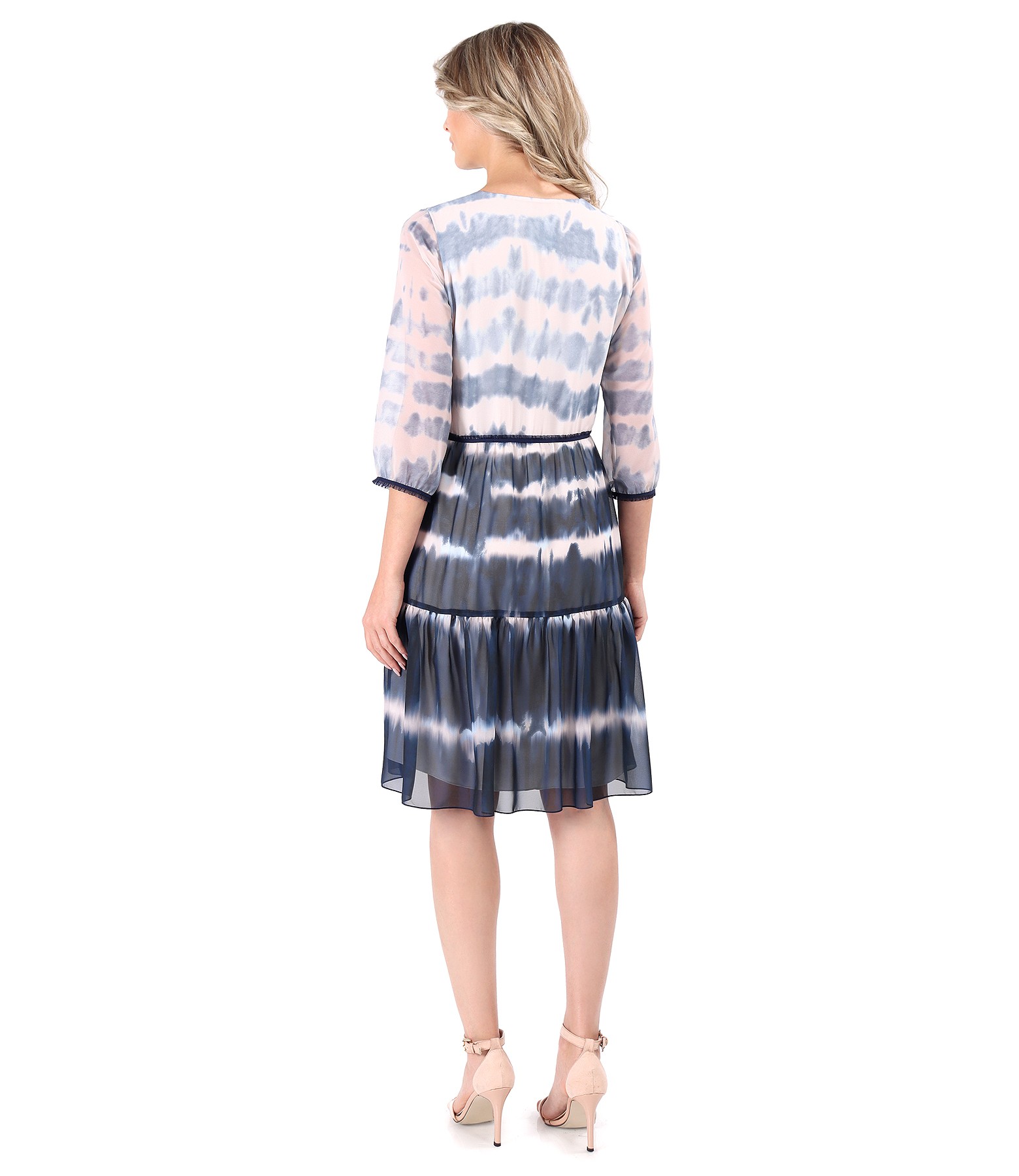 Dress with ruffles made of printed veil, padded with viscose, with 3/4 sleeves and round neckline. Without a closing system.