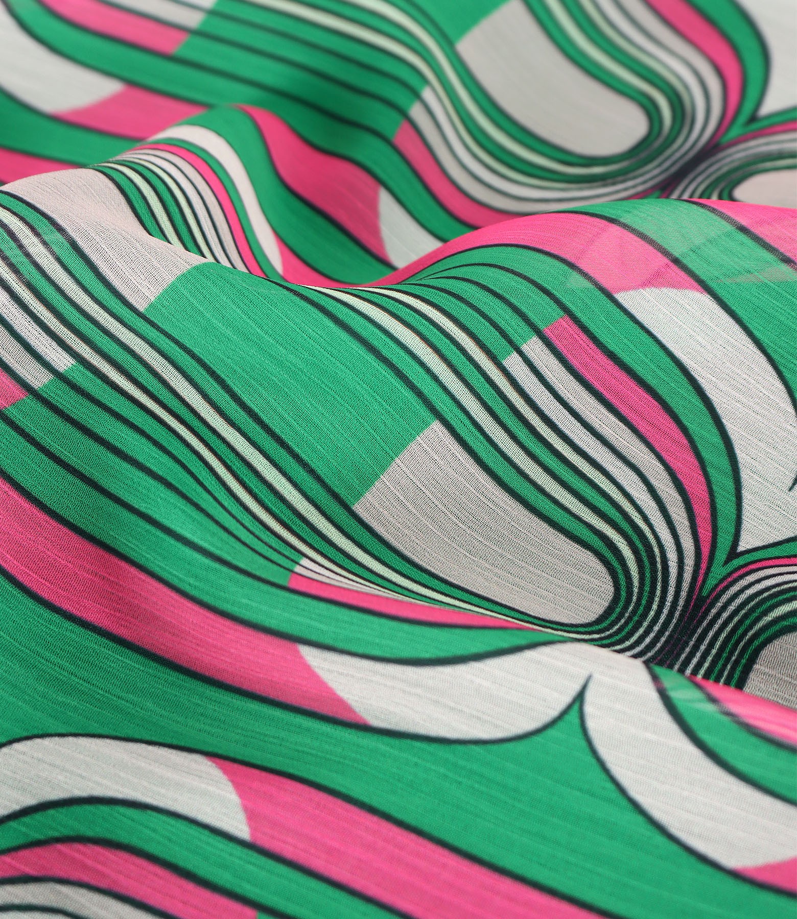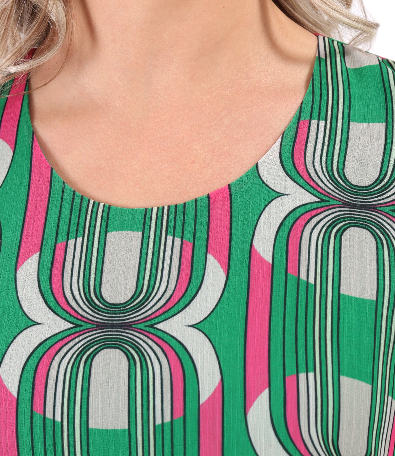 Casual dress with ruffles made of printed veil, doubled with viscose, with 3/4 sleeves and round neckline. Without closing system.