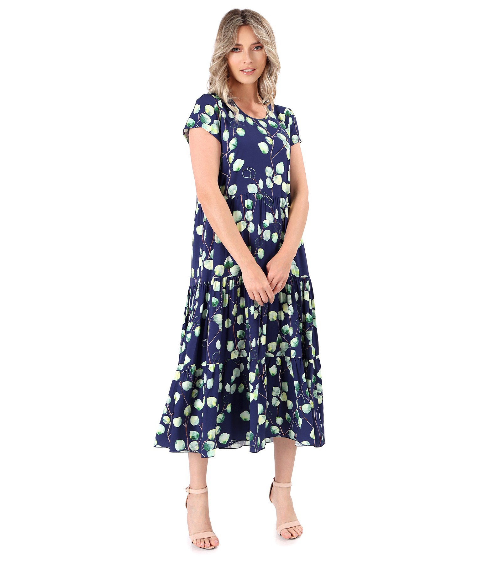 Midi dress with digitally printed viscose ruffles with floral motifs, short sleeves, side pockets, and round neckline. Without a closing system.