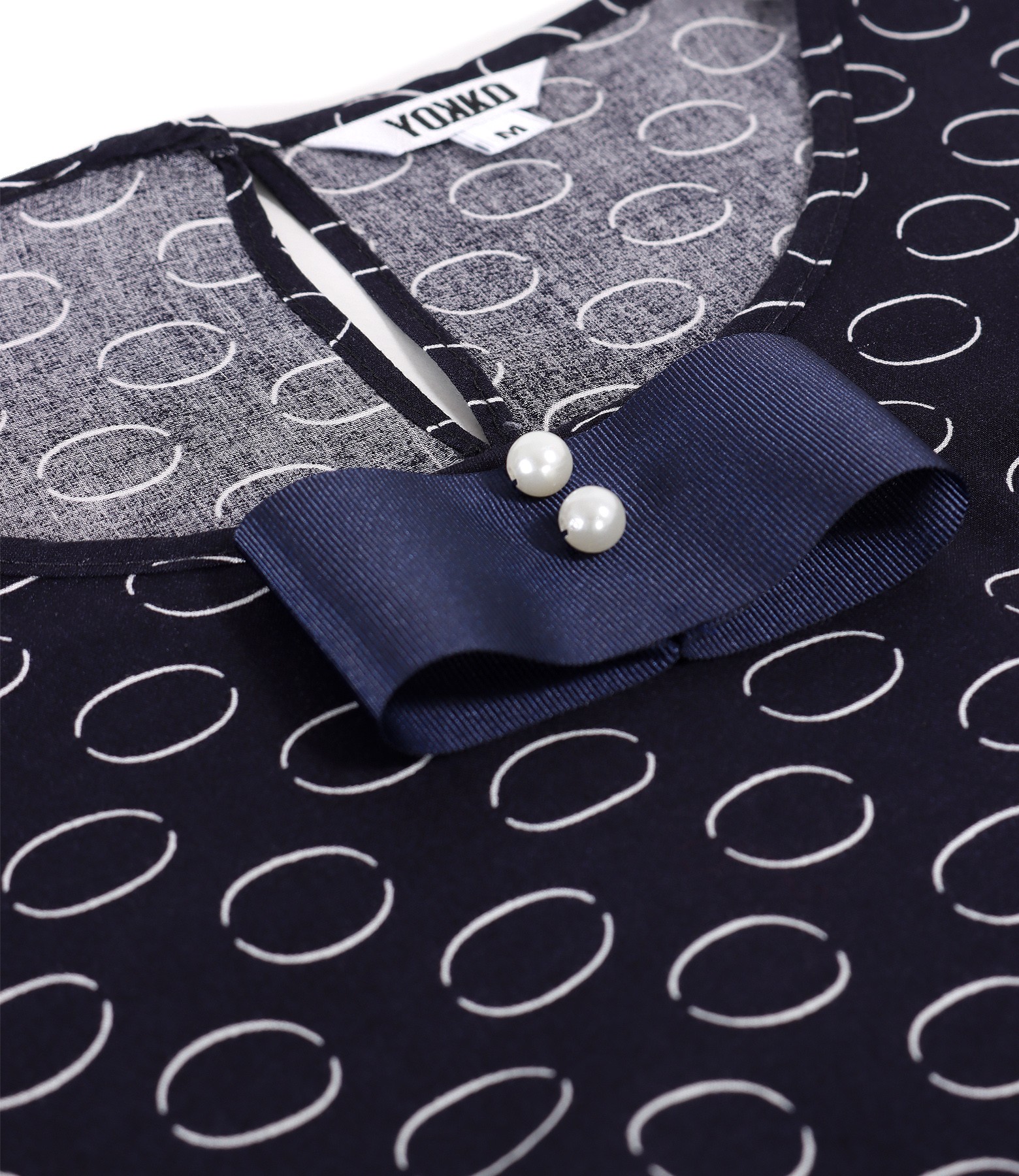 Viscose ruffled dress printed with hoops, unlined, with long sleeves and round neckline decorated with rips and pearl bow. It closes with a button on the middle back.