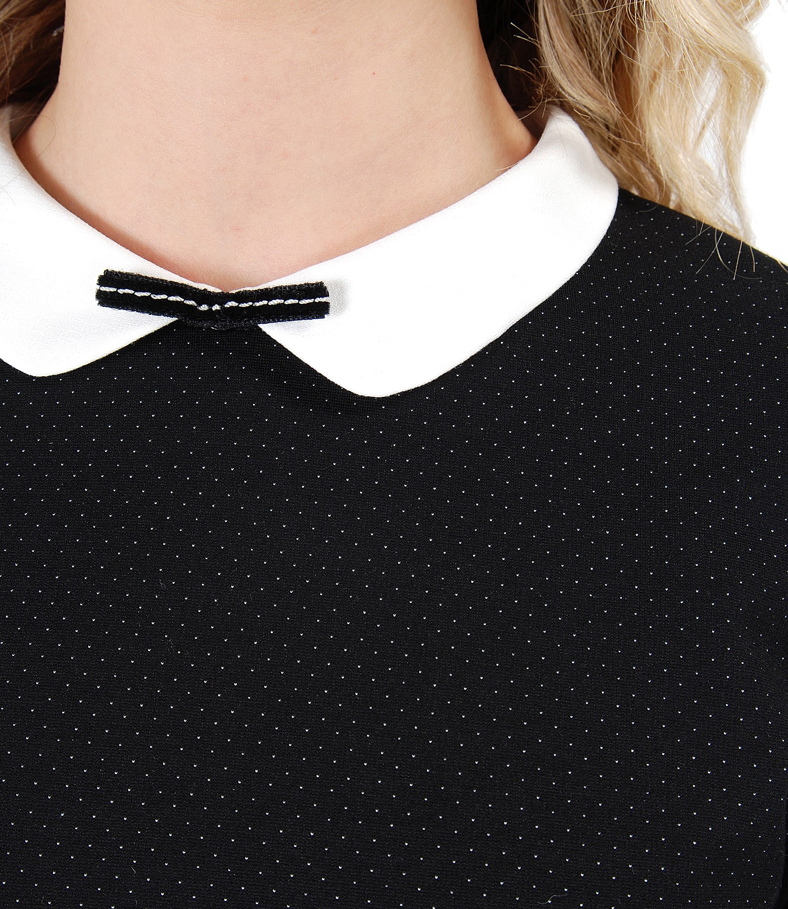 Dress with white collar and elastic jersey bow, brocaded with polka dots, unlined, with 3/4 sleeves, side pockets and round collar with bow. Closes with a hidden zipper on the middle back.
