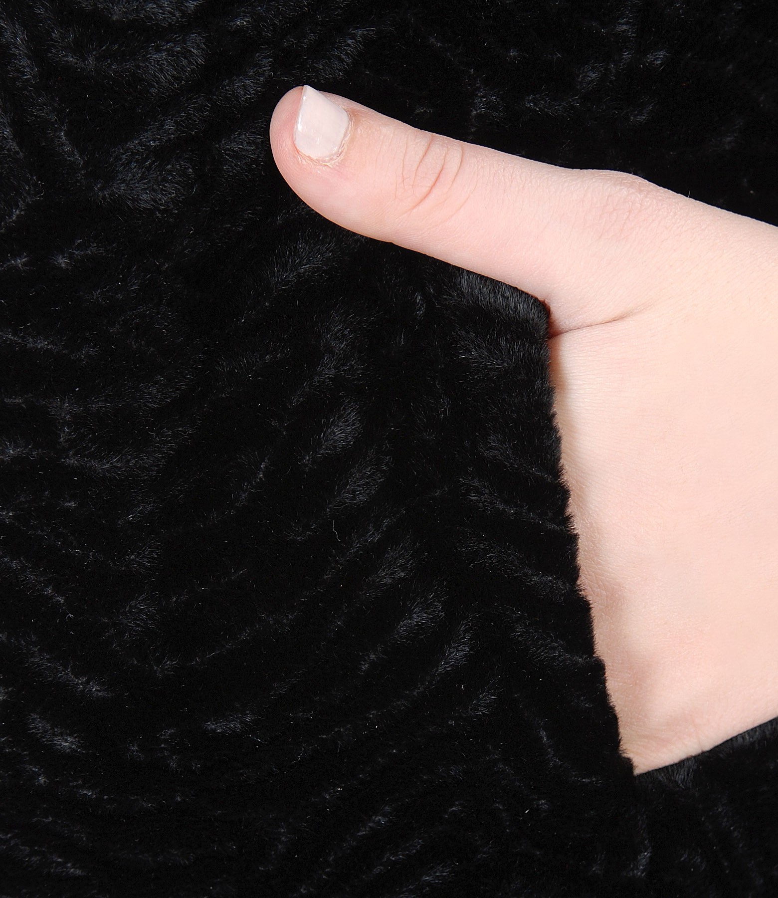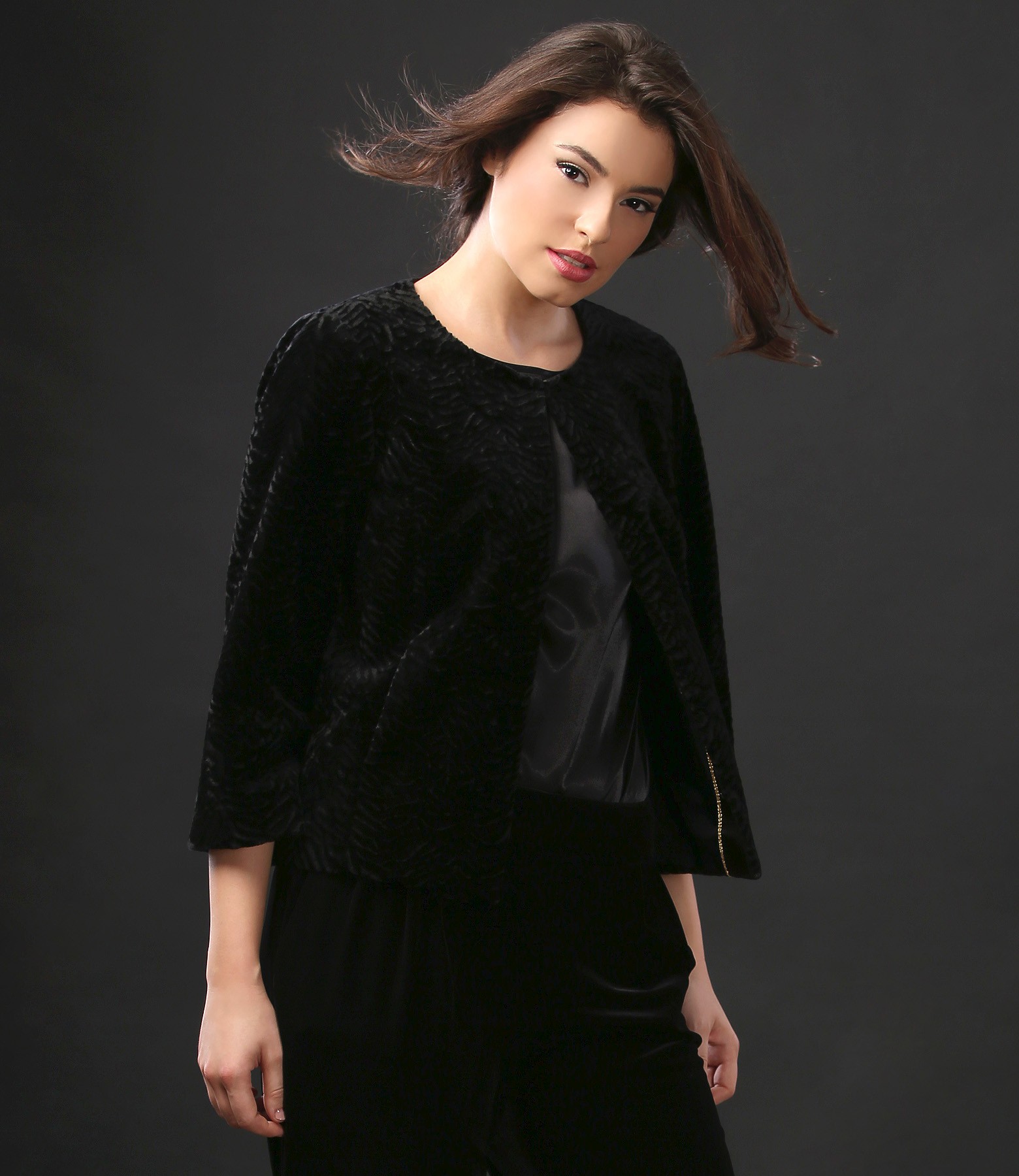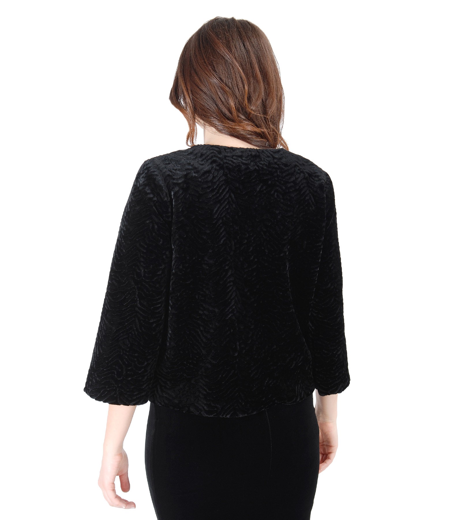 Ecological fur jacket with astrakhan type structure, padded, without collar and lapels, with side pockets and 3/4 sleeves. Closes on the face with 5 rings.
