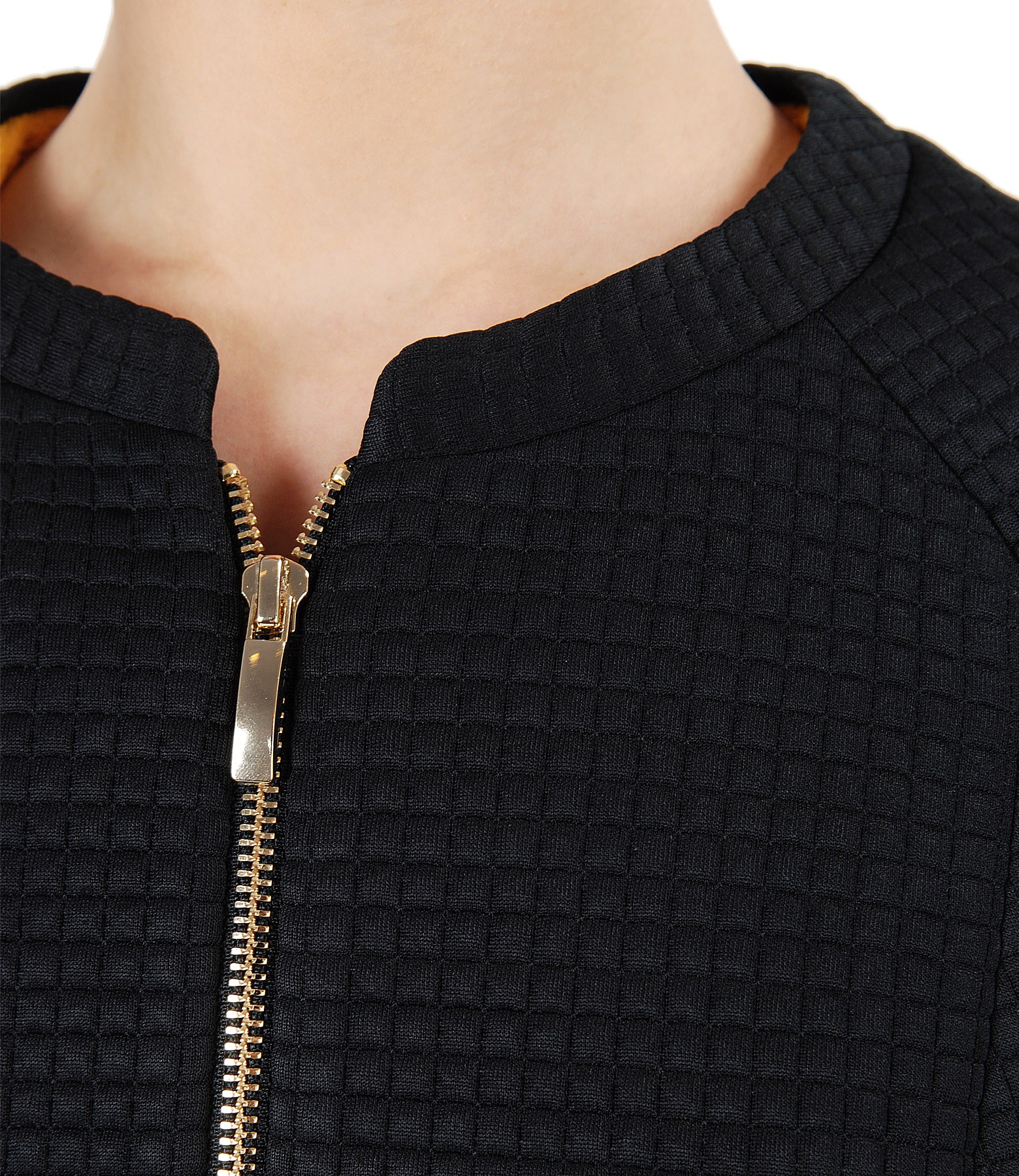 Elastic brocade bolero with geometric motifs, padded, with tunic collar, 3/4 sleeves, hidden vertical pockets. Closes with front metallic zipper.