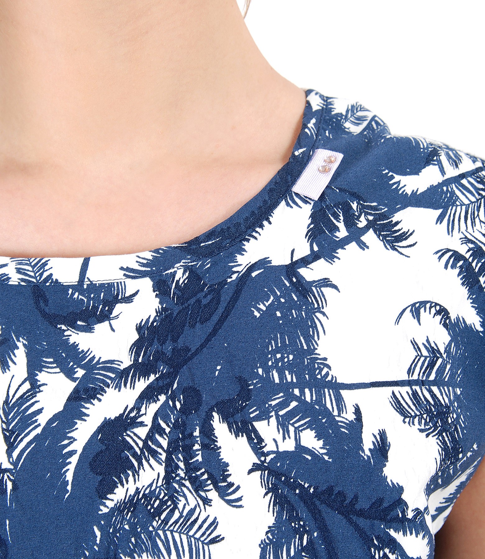 Elegant dress made of elastic brocade with floral print, inlay, without sleeves, round low-cut neck and rips band on decolletage. Closes with hidden zipper on the middle back. The print position varies per product.