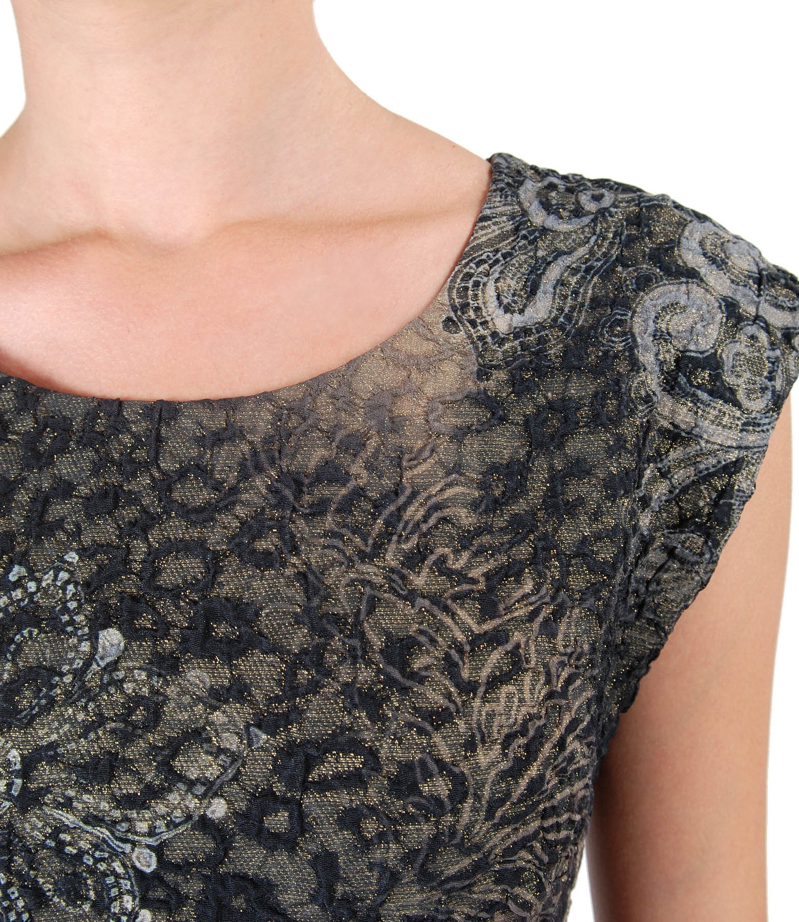 Elastic brocade dress with gold metallic thread, padded, with draping sleeves and round low-cut neck. Closes with hidden zipper on the middle back. The position of the print varies per product