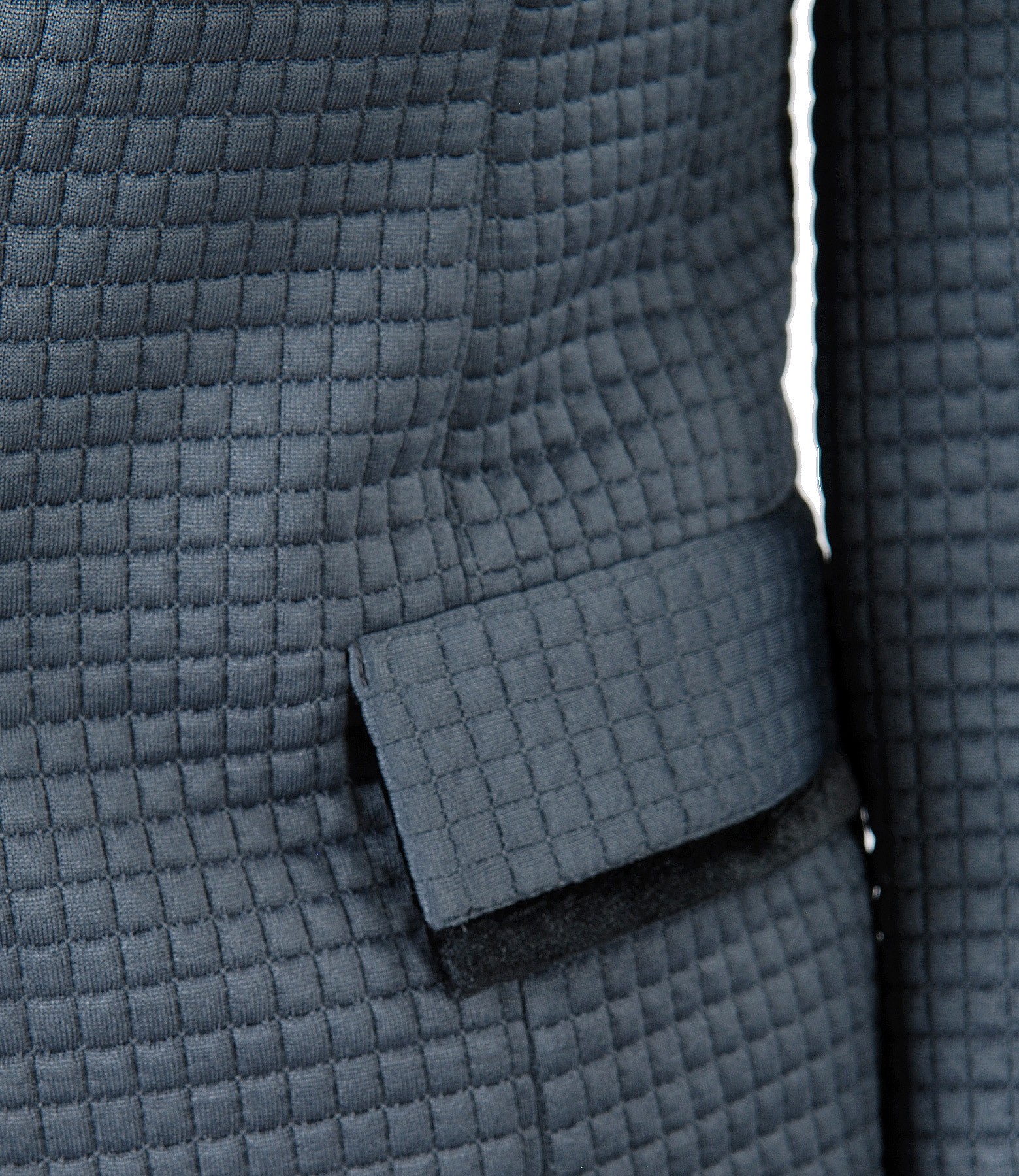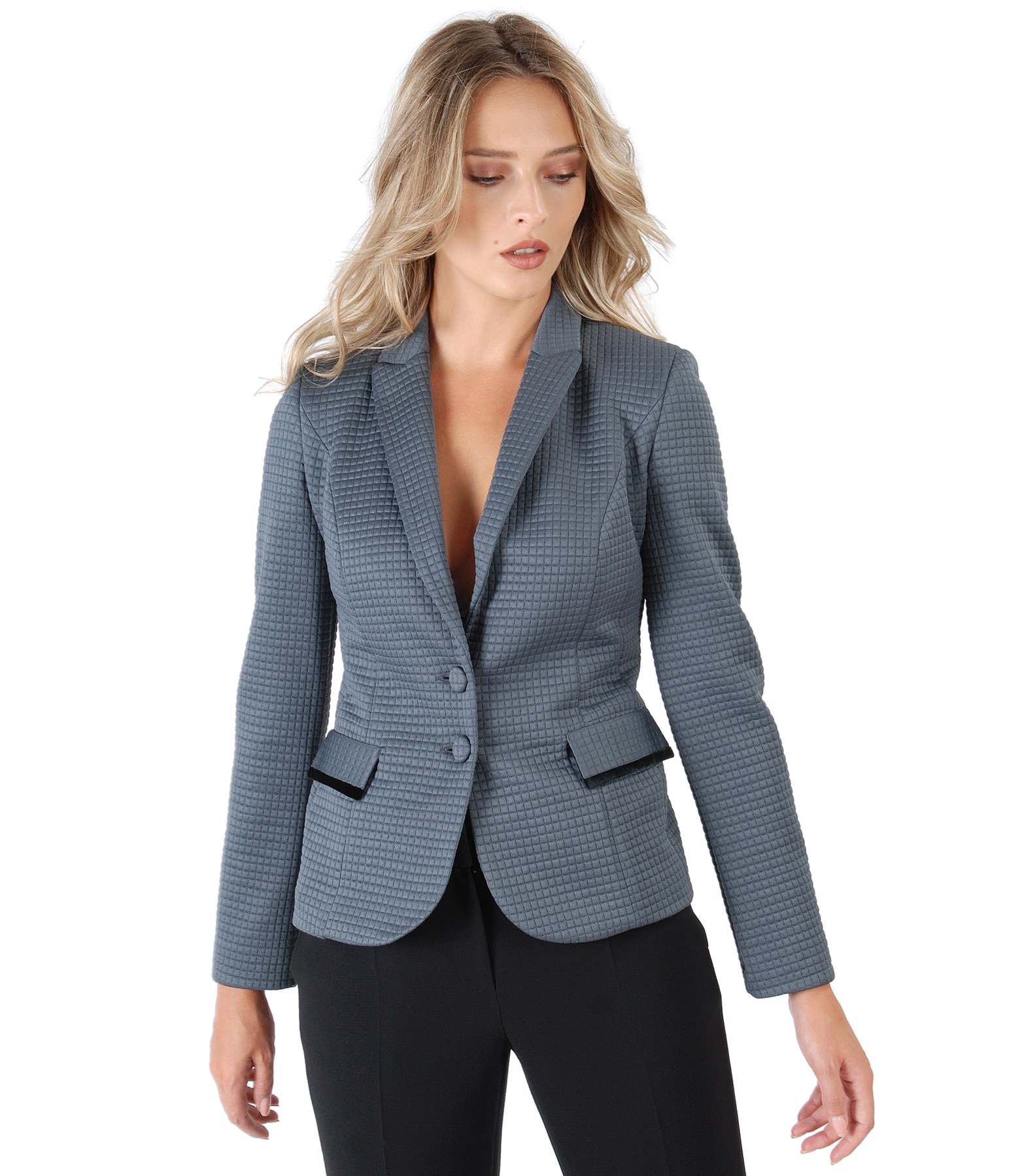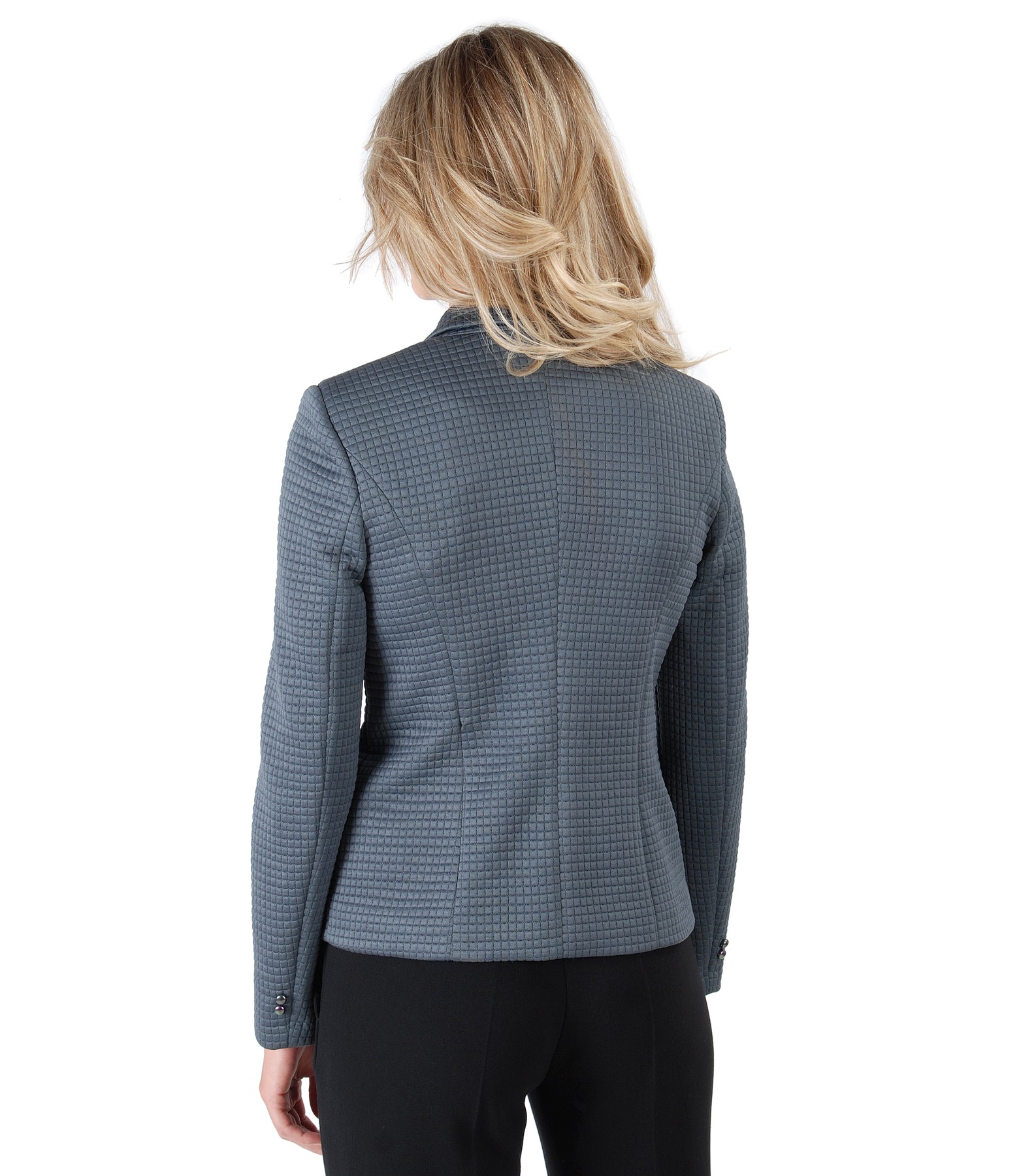 Elastic brocade jacket with geometric motifs, padded, with long sleeves, collar, lapel and decorative flaps with velvet band at edge. Closes with 2 front buttons.