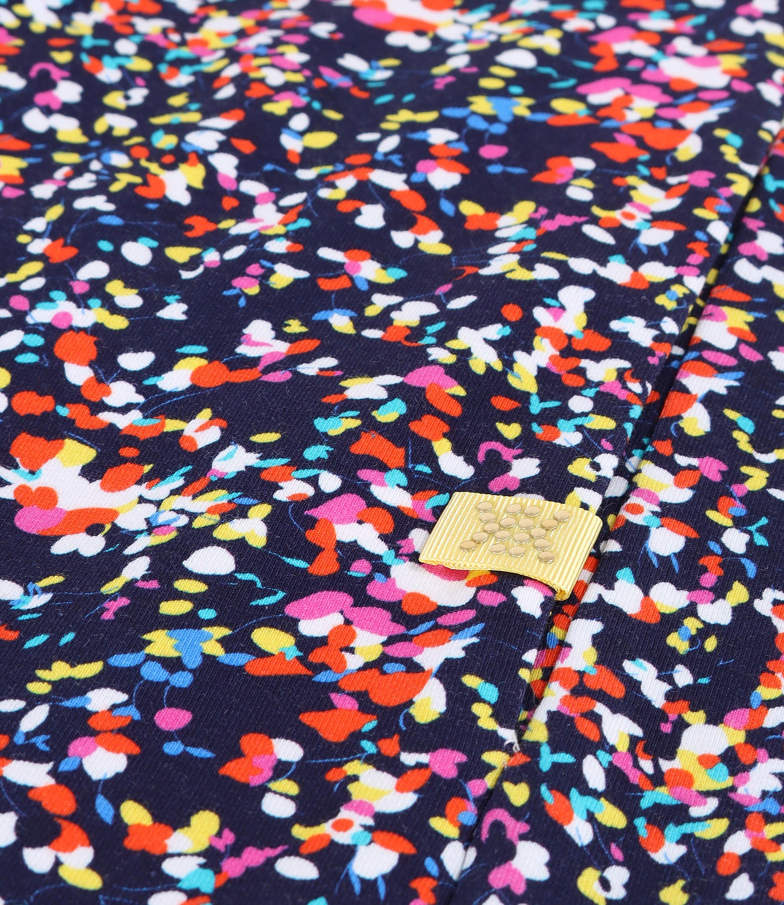 Elastic cotton dress, printed with floral motifs, unlined, with short sleeves, round neckline, and side pockets.