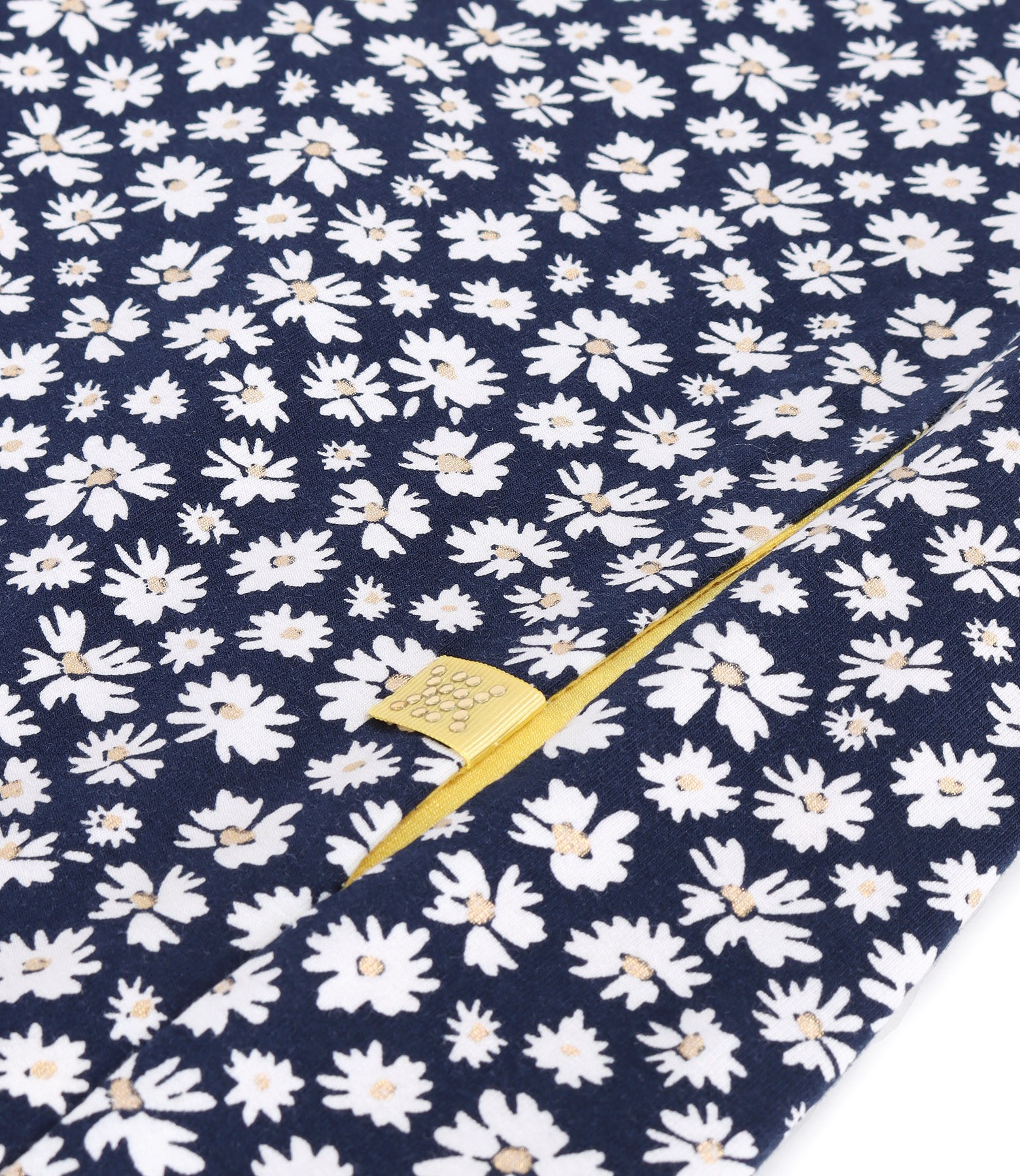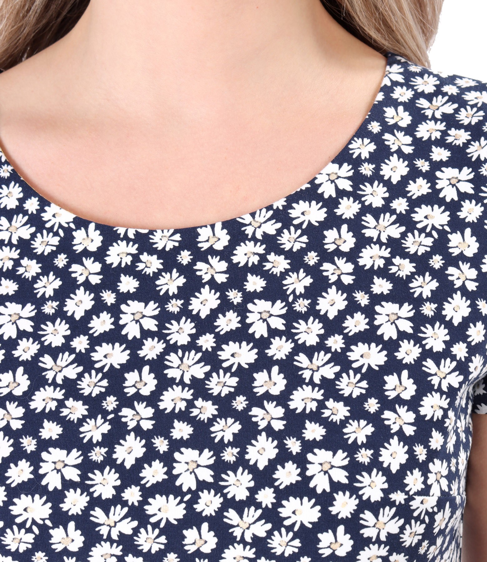 Elastic cotton dress, printed with floral motifs, unlined, with short sleeves, round neckline, and side pockets.