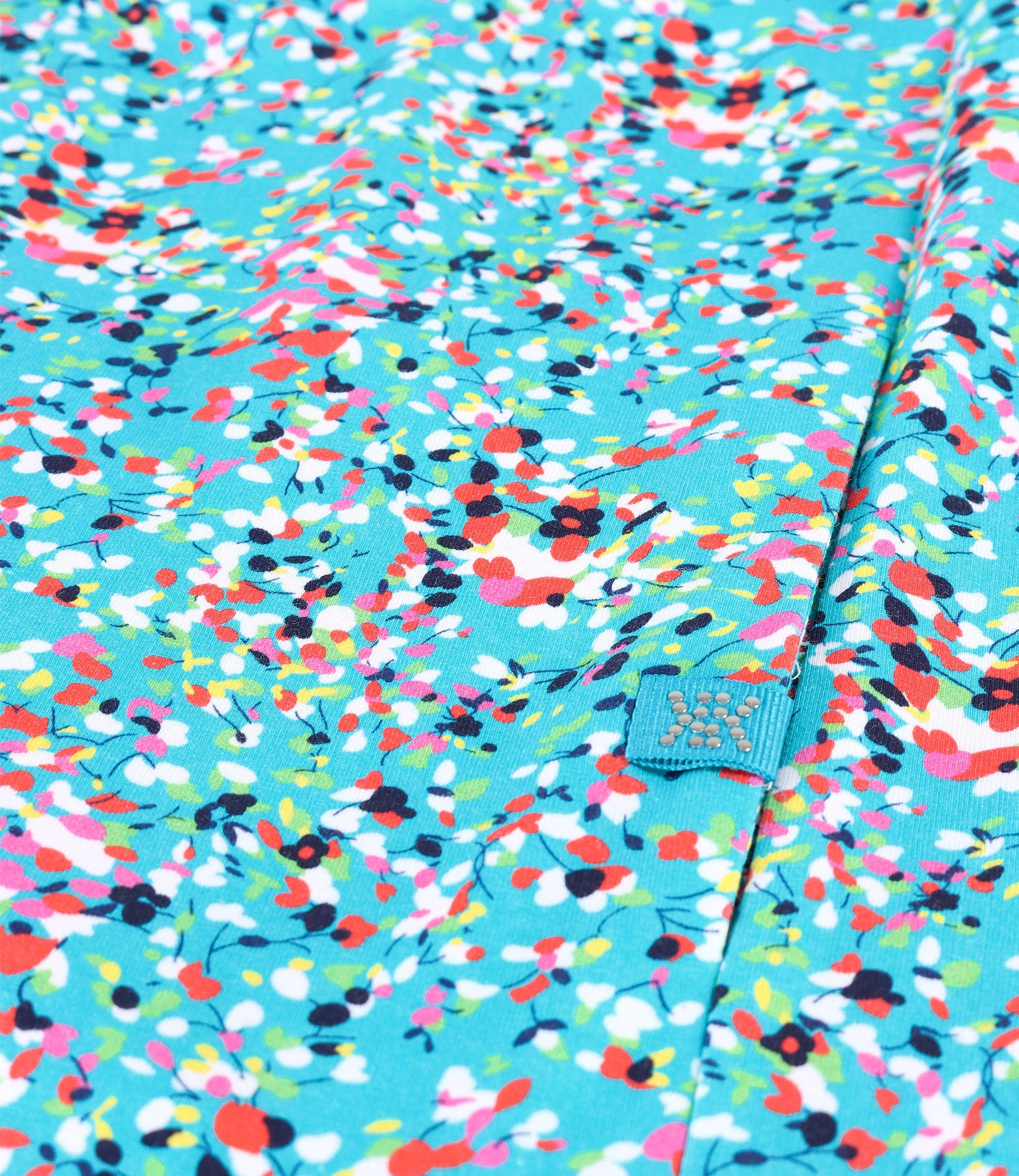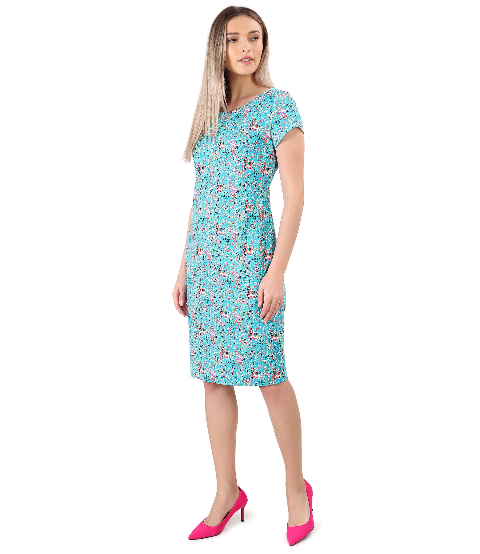 Elastic cotton dress, printed with floral motifs, unlined, with short sleeves, round neckline, and side pockets.