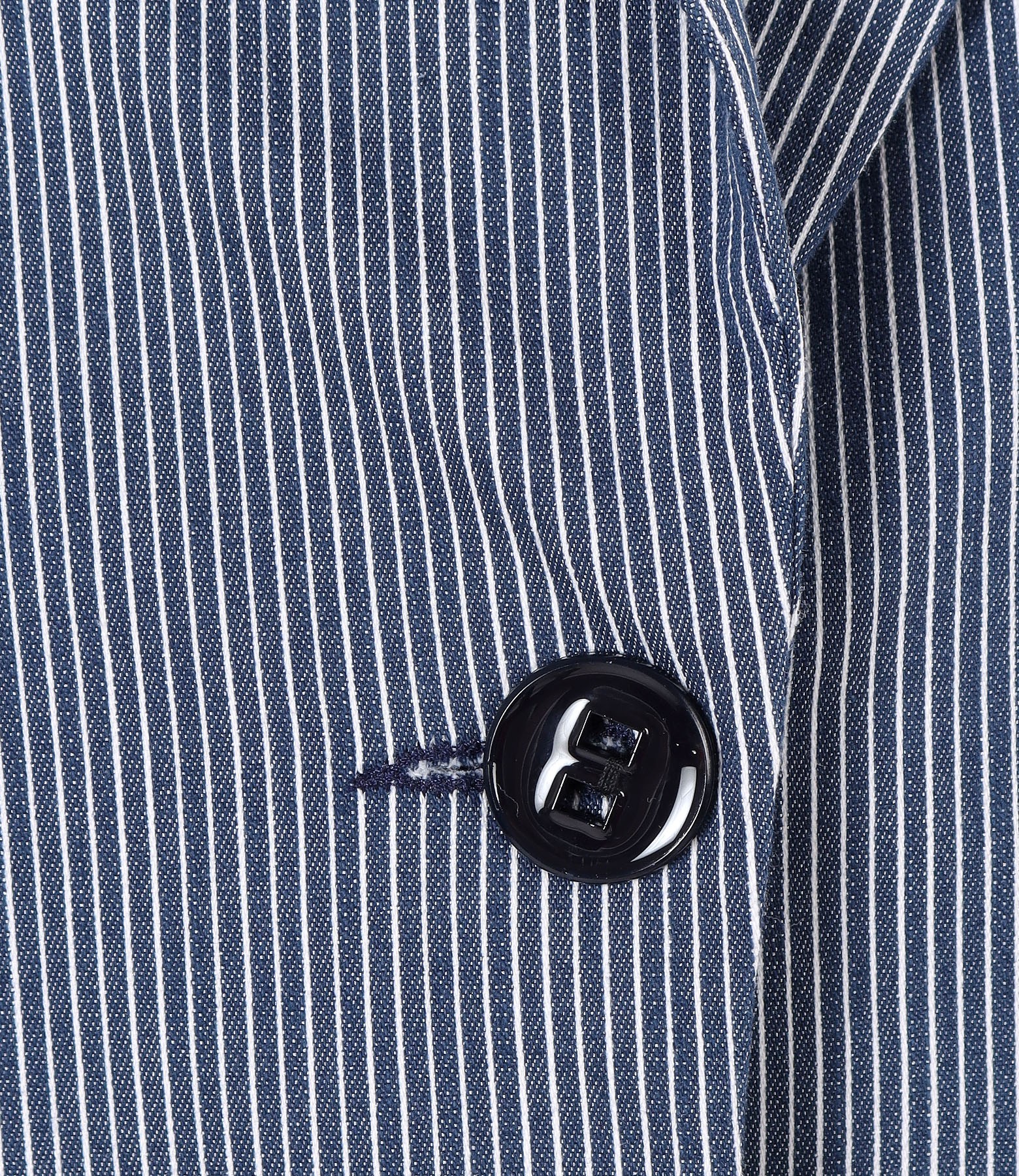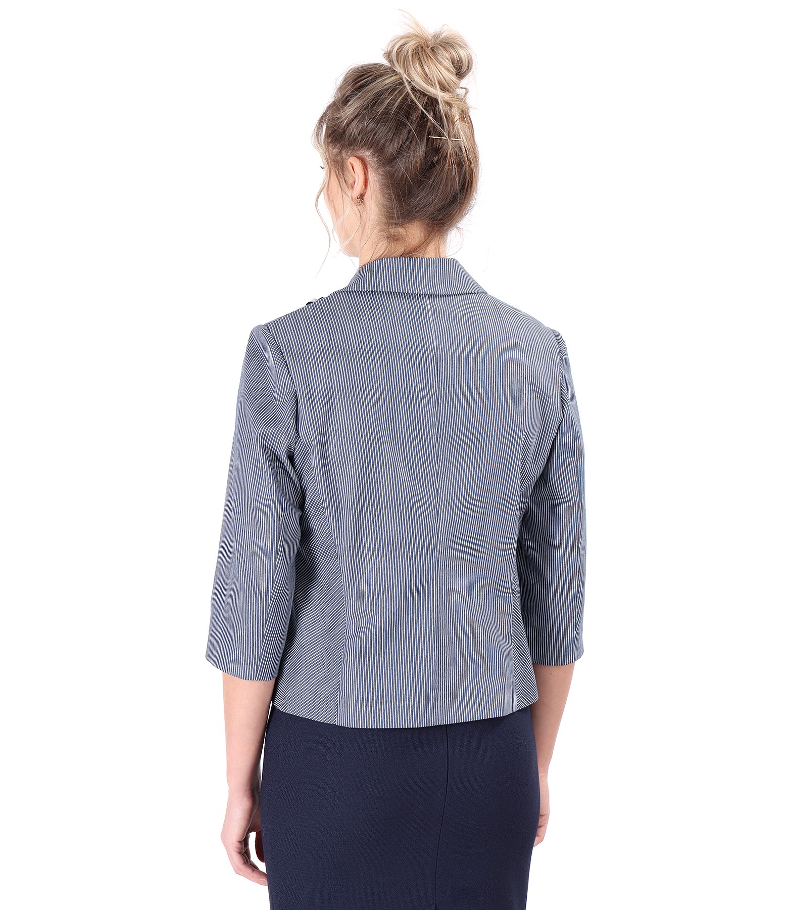 Office jacket,made of elastic cotton with stripes,arched with 3/4 sleeves and pine-shaped flower at the neckline.Closes with a button on the face.