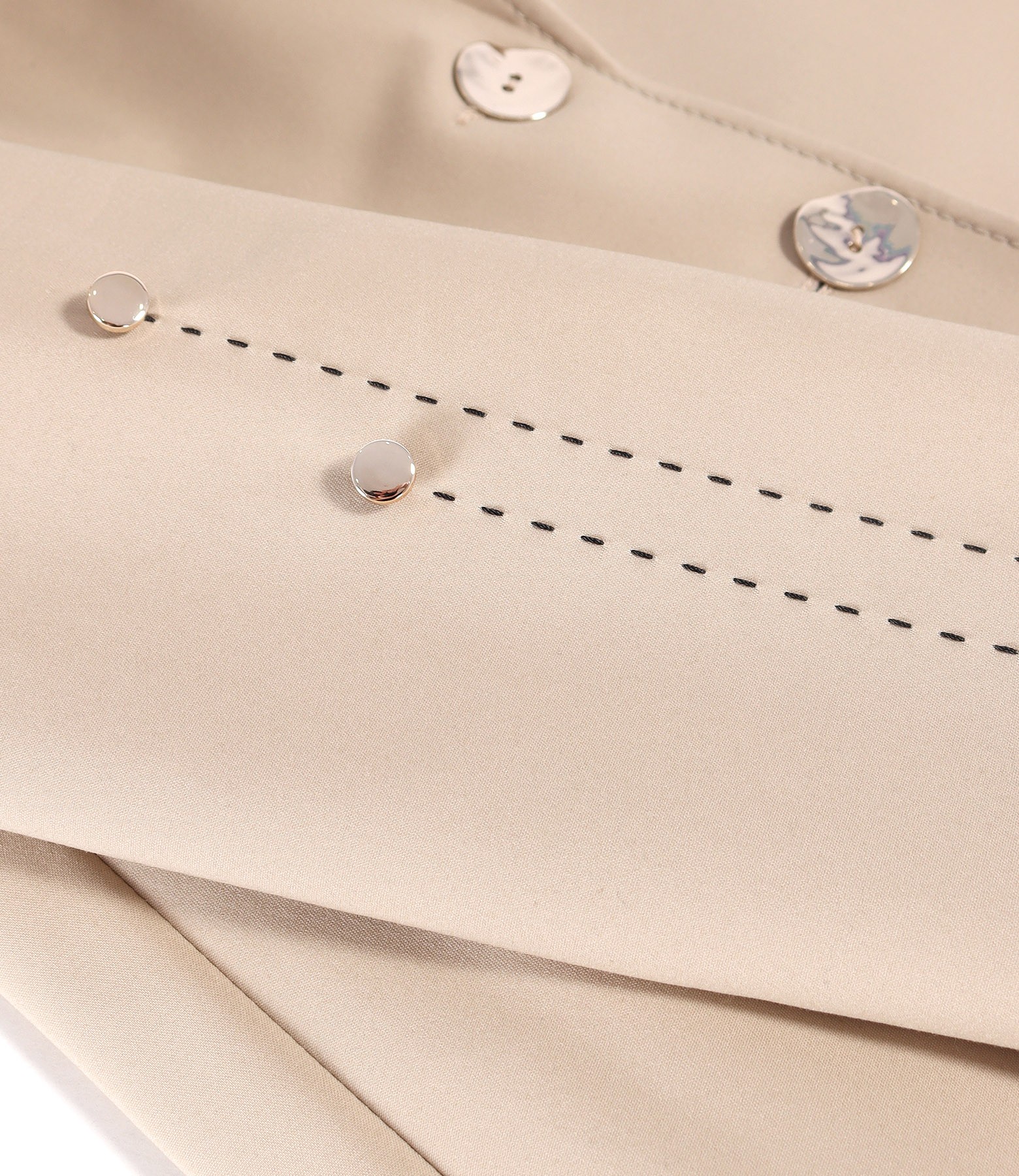 Office jacket made of elastic cotton with a velvety appearance, padded, with a deep neckline and decorative stitching in contrast. It closes with two golden buttons on the front. On the sleeves, the contrasting decorative stitching ends with 2 golden buttons.