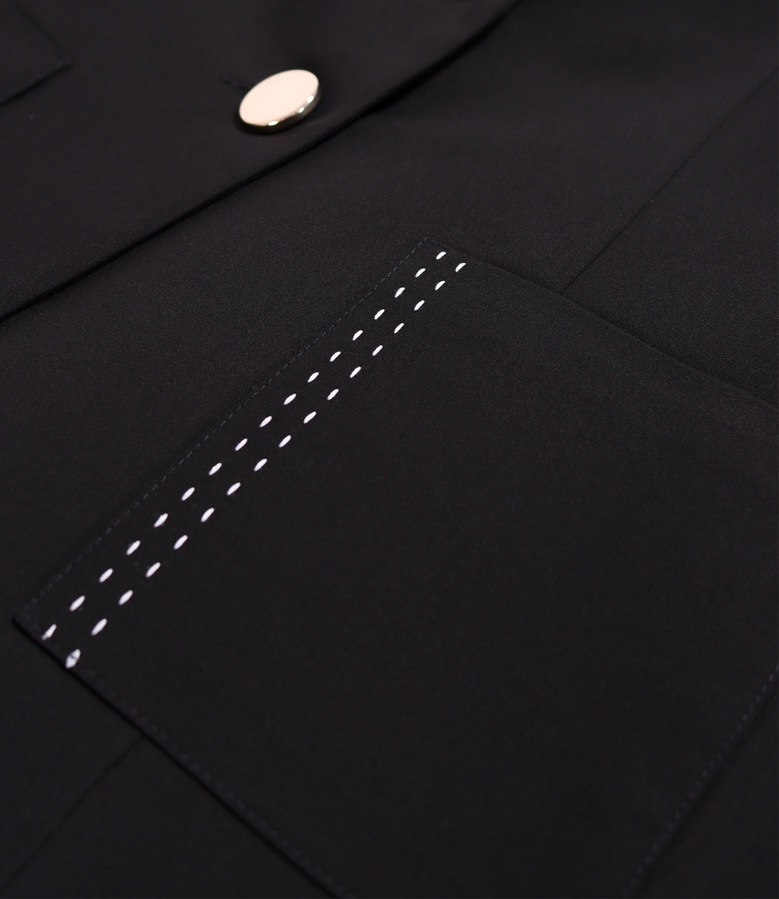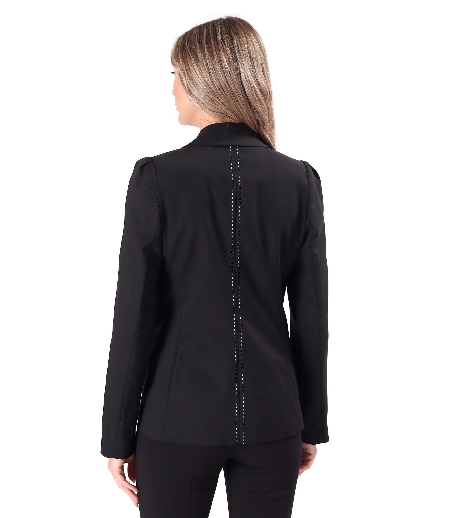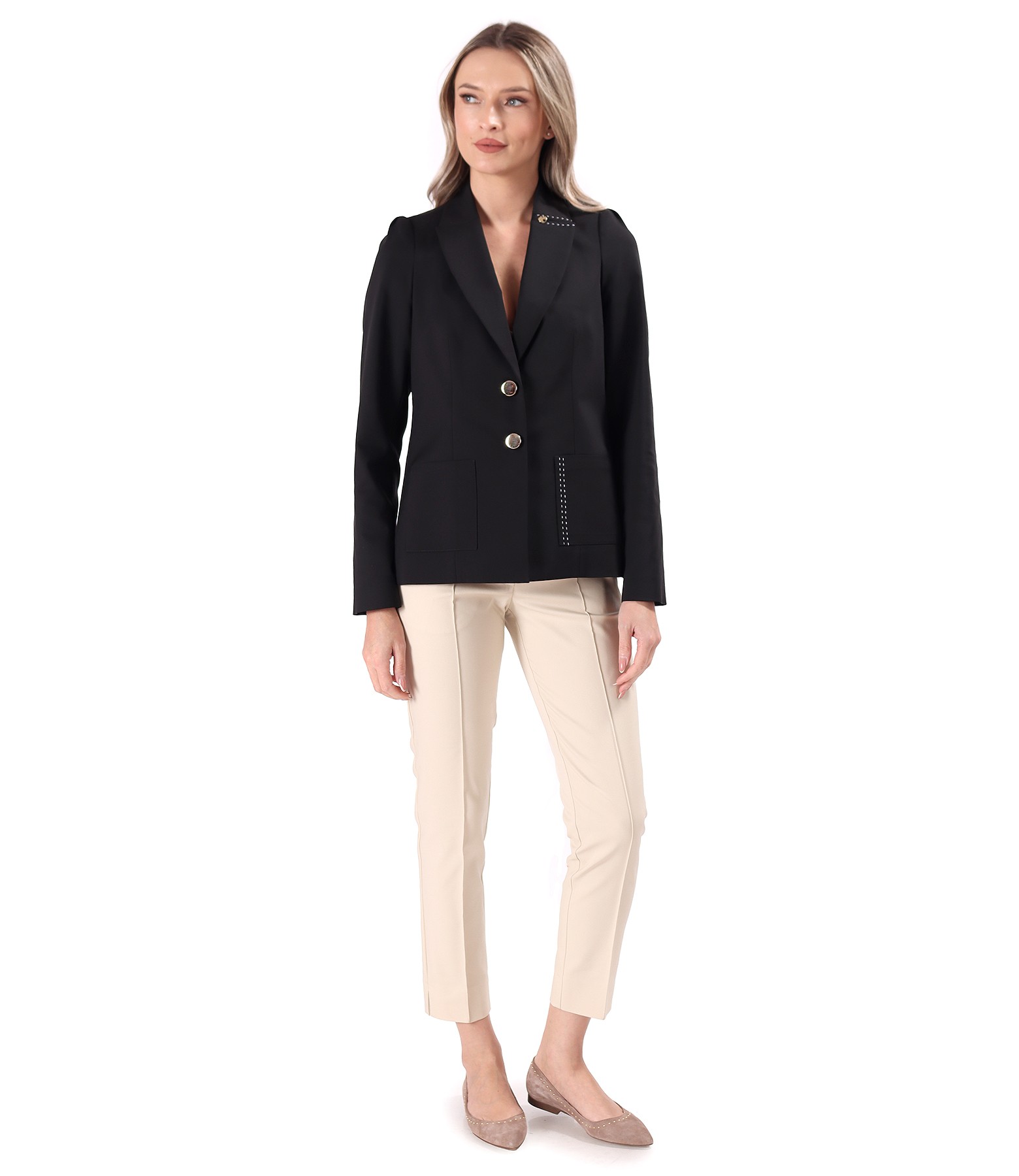 Office jacket made of elastic cotton with a velvety look, lined, featuring a deep neckline and applied front pockets. It has contrasting decorative stitching on the pocket and left lapel. It fastens with two golden buttons at the front.