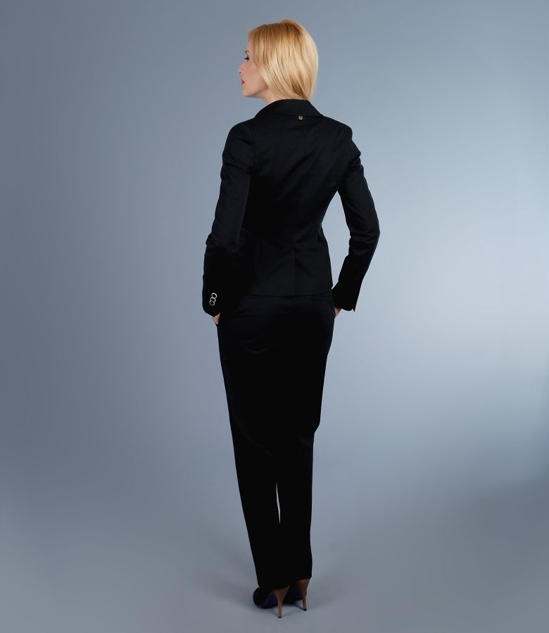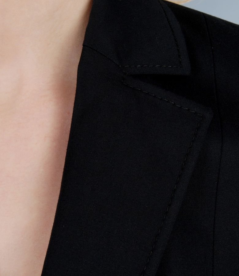 Elasticized cotton jacket, with deep neckline, straight collar and lapels and two pockets with refilet on front. Sleeves with fake slit closed with 3 buttons and slit on middle back. Closes with one button on font.