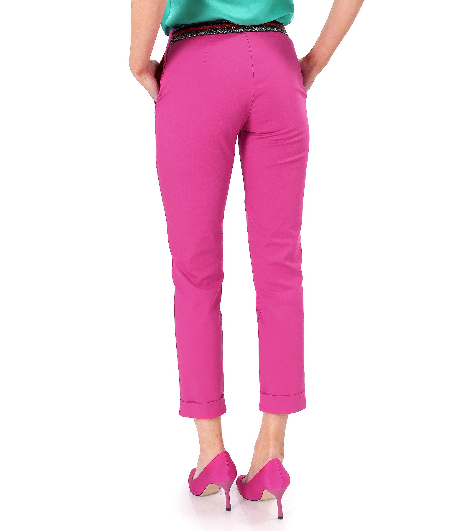 Elastic cotton pants, with front pockets and cuff at the end and multicolored elastic with metallic thread at the waist. It closes with a normal zipper and 2 staples on the face.