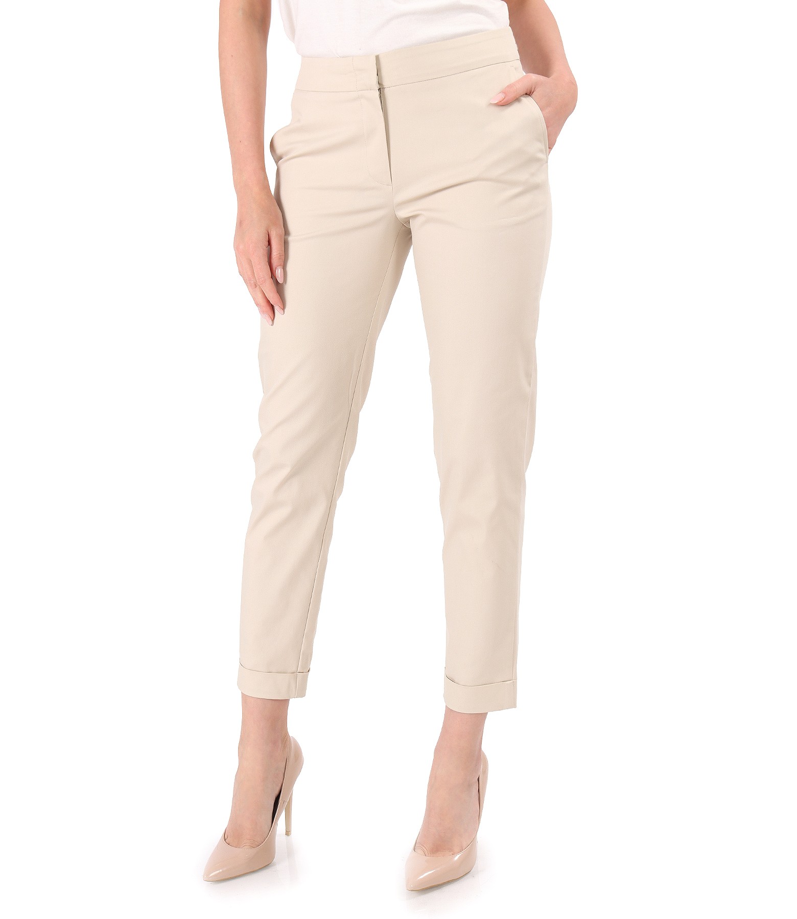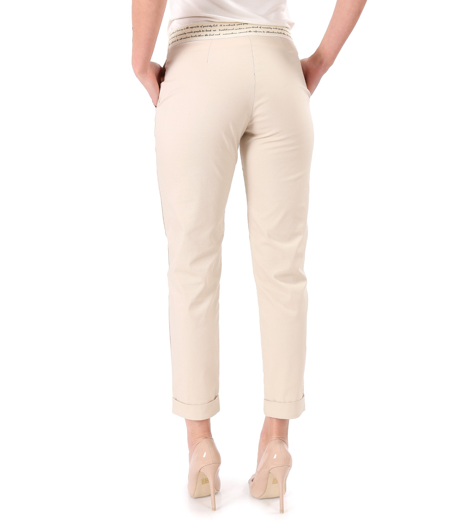 Elastic cotton pants, with front pockets and cuff at the end and decorative elastic at the waist. It closes with a normal zipper and 2 staples on the face.