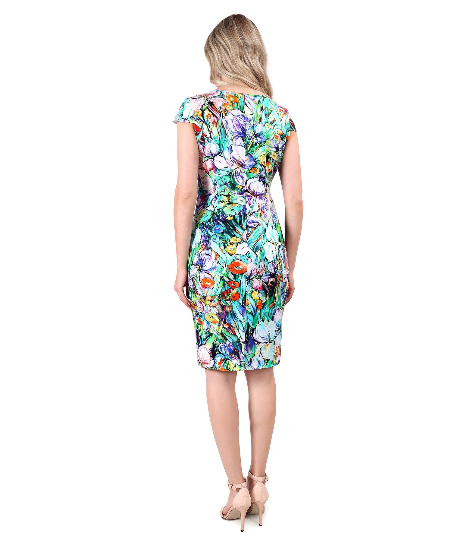 Elastic cotton satin dress digitally printed with floral motifs. The dress is unlined, has a slit on the skirt at the back and closes with a zipper hidden in the middle of the back.