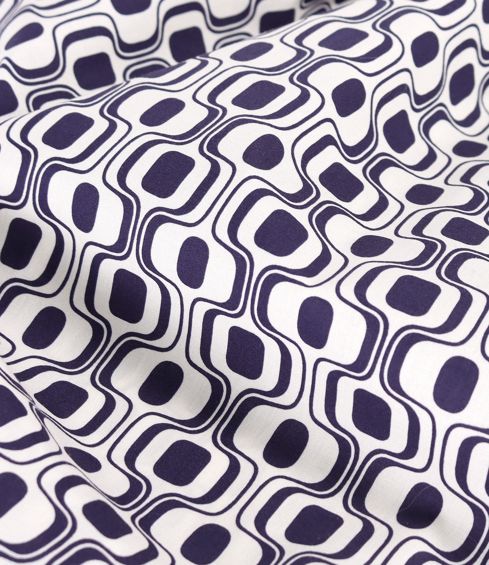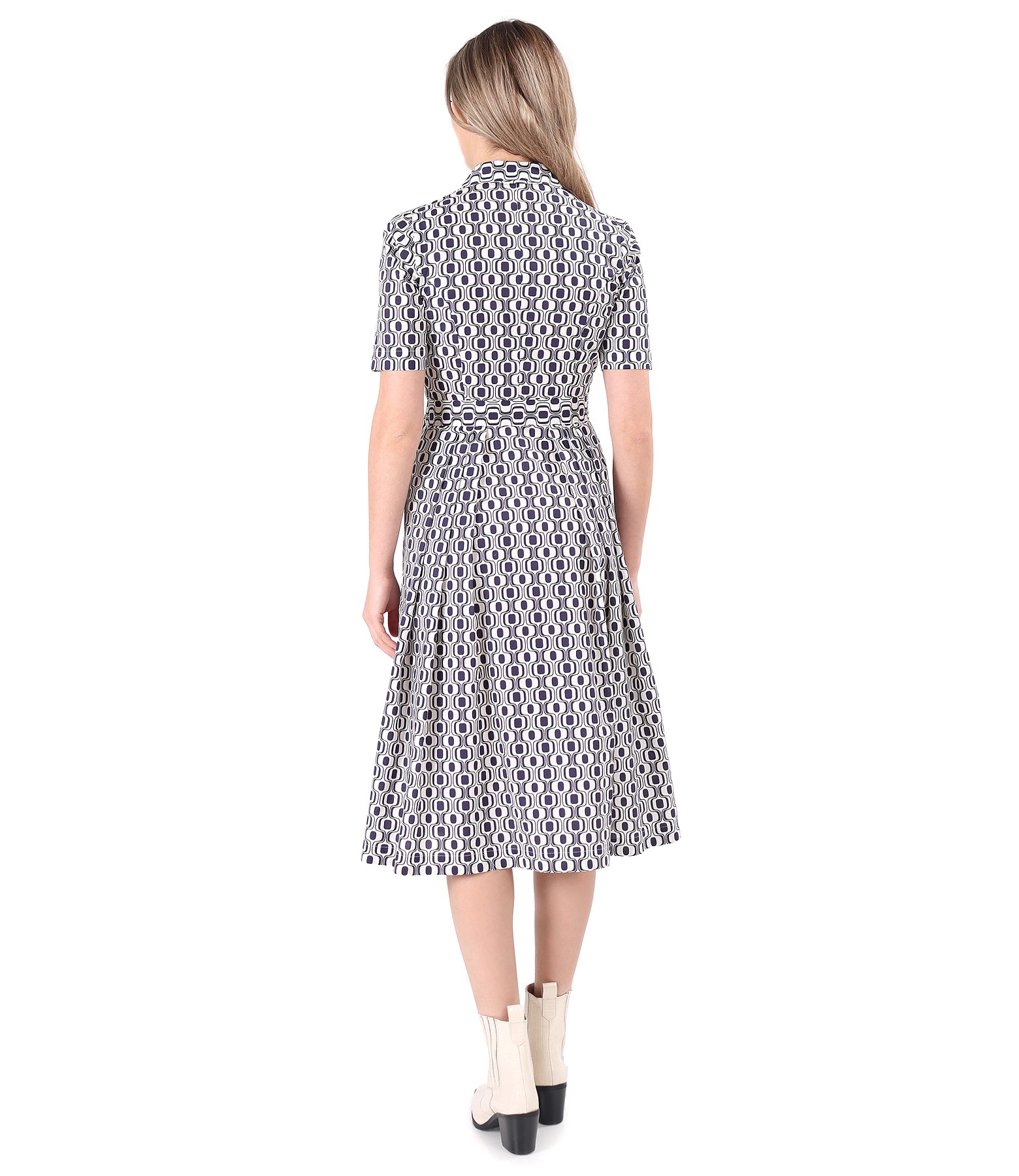 Printed elastic cotton shirt dress with digital geometric motifs, with pleats on the front and back, short sleeves, and drawstring at the waist. It closes with 12 buttons in the middle of the front.