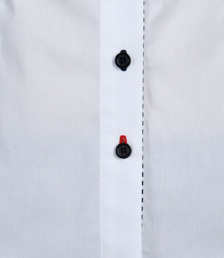 Button front elastic cotton fitted shirt, long sleeves with wristbands closed with 2 buttons each. Trim applied on the inside edge, sleeves and on sides.