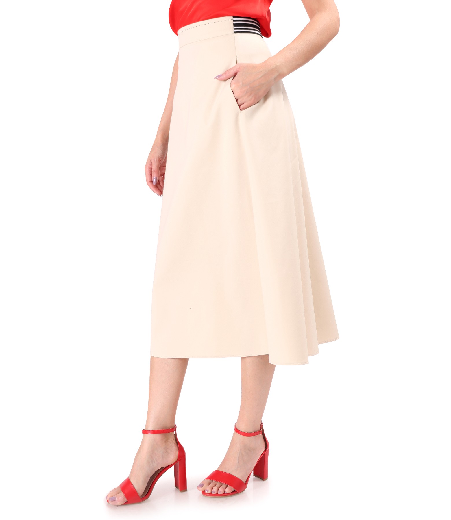 Elastic cotton skirt with a velvety look, with elastic waistband and decorative stitching and side pockets. Closes with hidden zipper on the middle back.