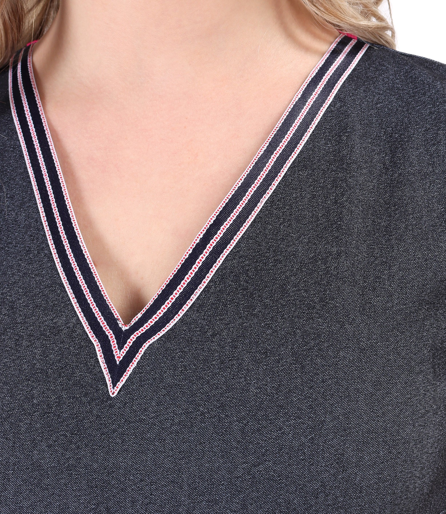 Elastic denim office dress, unlined, without sleeves, and round neckline with rips band. Without closing system.