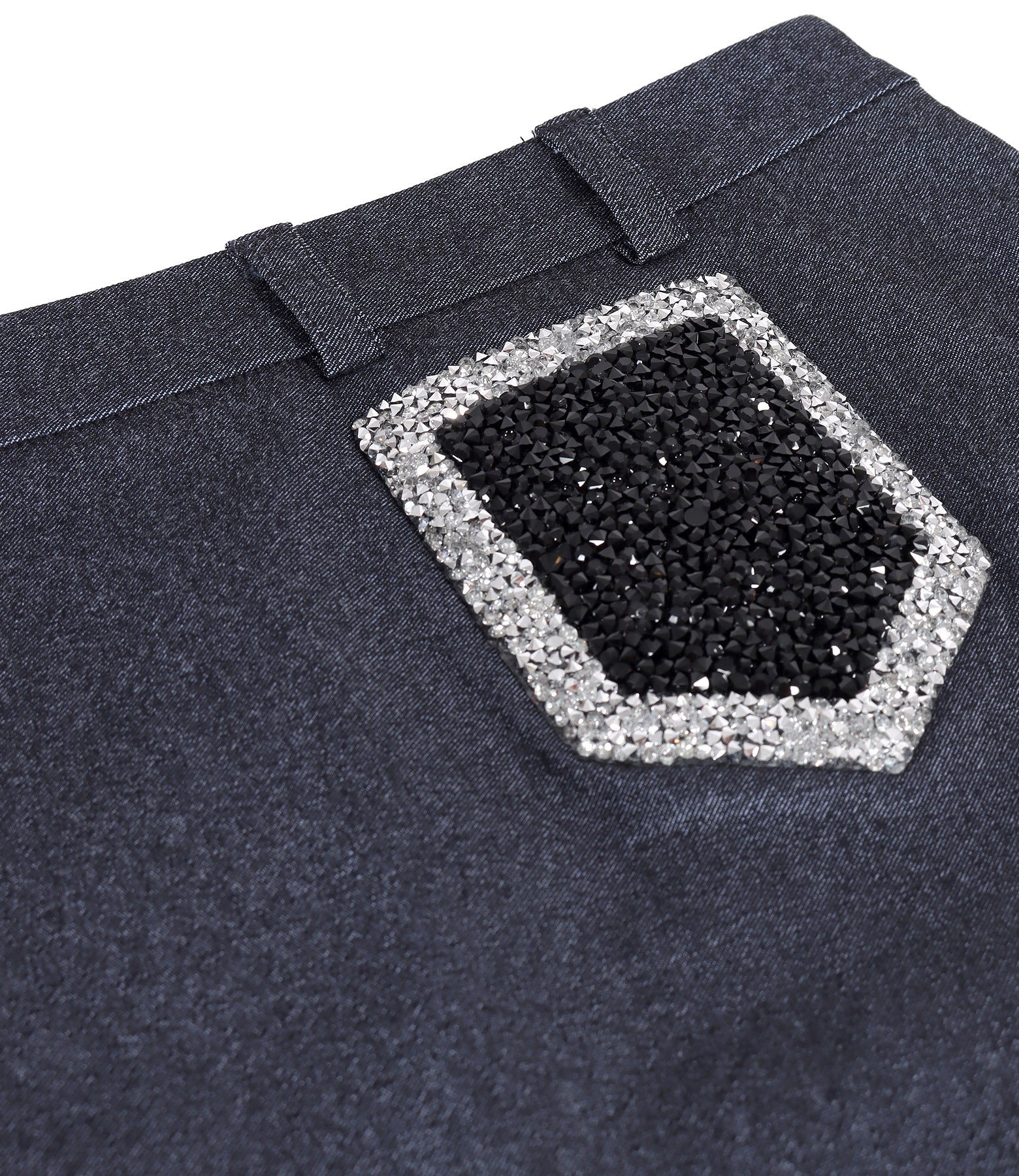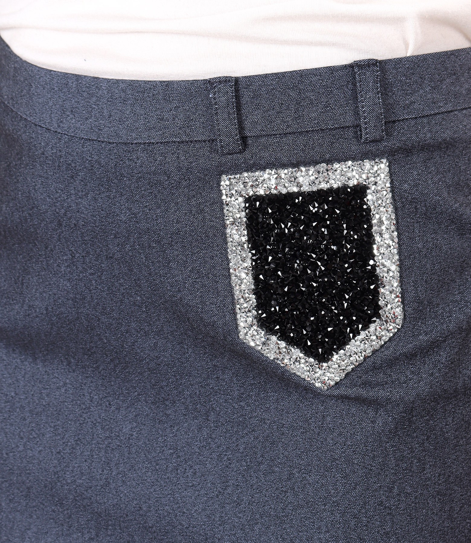 Elastic denim office skirt, unlined, with drawstring at the waist, decorative pocket and slit at the back. It closes with a zipper hidden in the middle of the back.