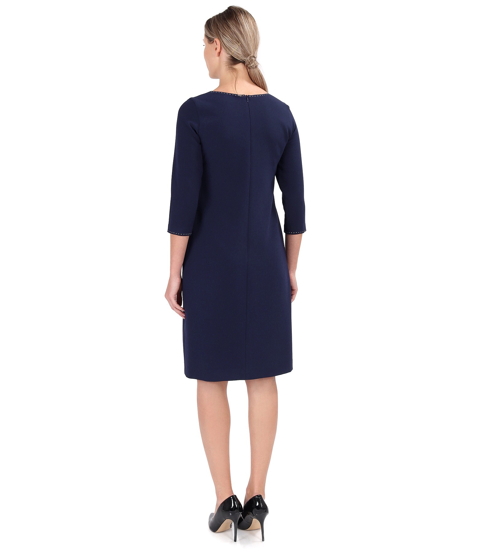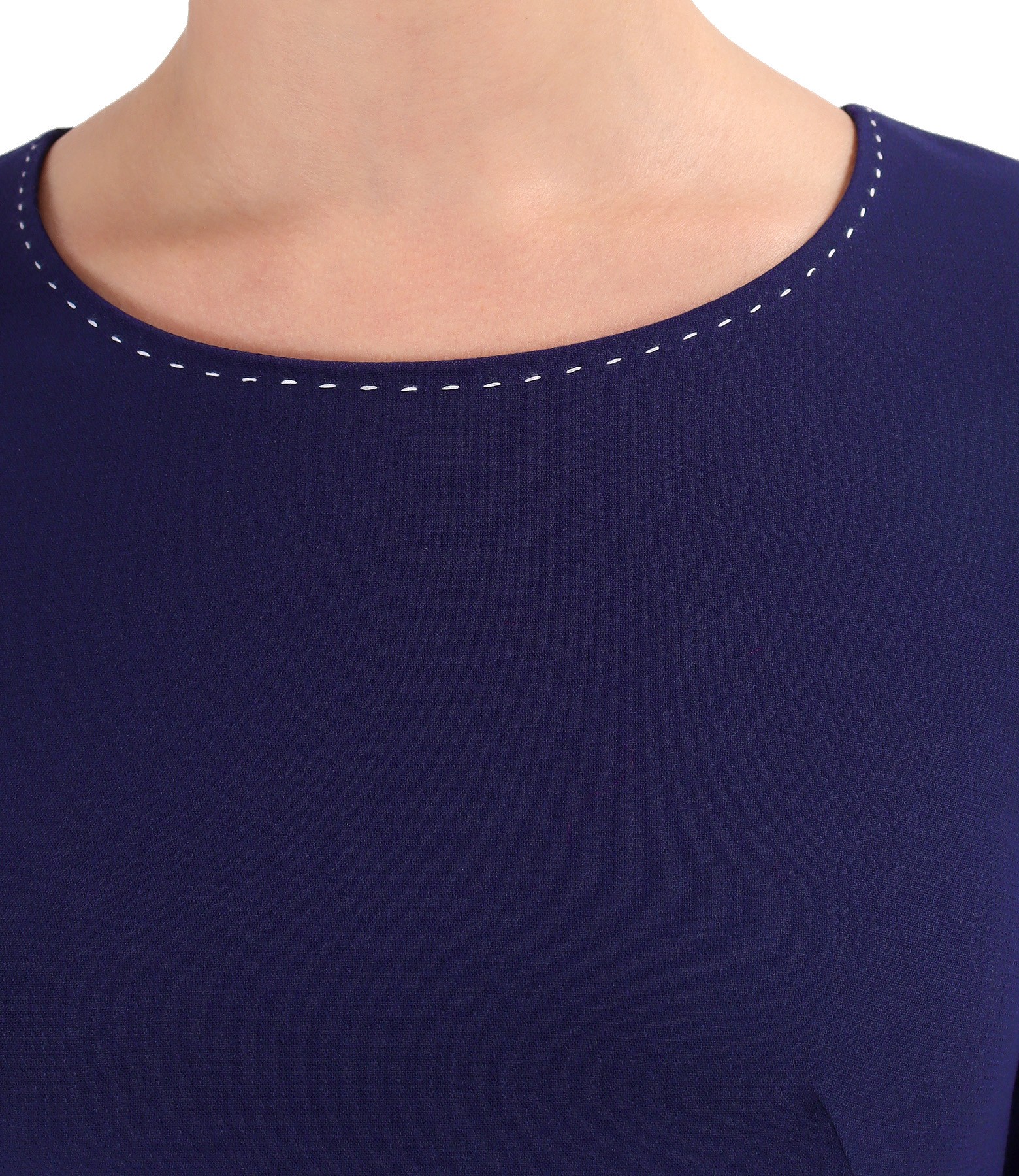 Elegant dress made of elastic fabric, padded, A-shaped, decorated with rips at the waist and decorative stitching in contrast at the decolletage and sleeves. Closes with a hidden zipper on the middle back.