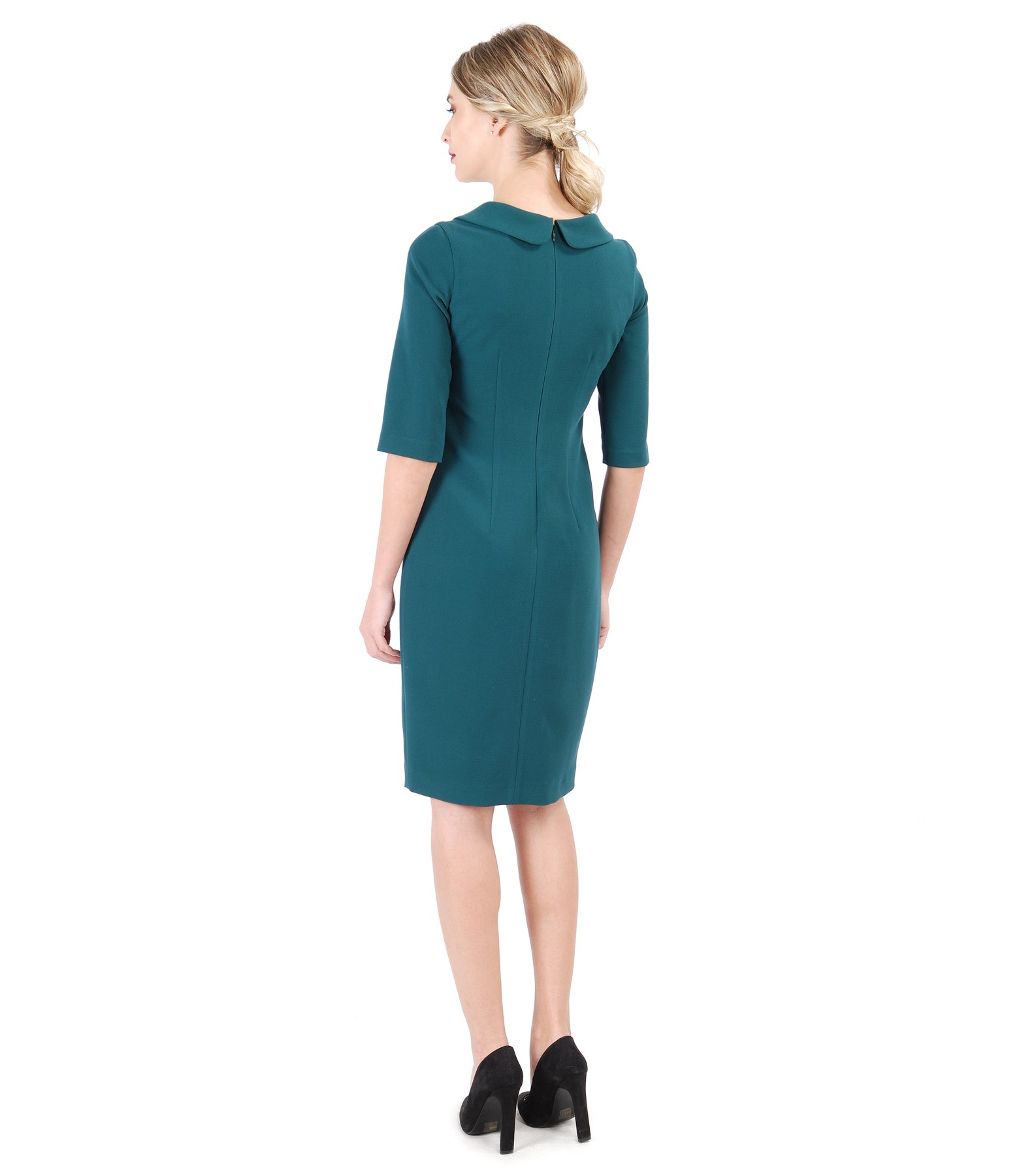 Midi dress made of elastic fabric, padded, with 3/4 sleeves, round collar, embellished with crystals from on decolletage. Closes with hidden zipper on the middle back.