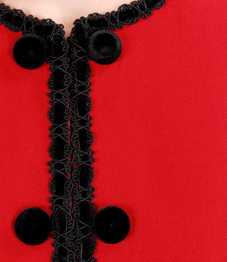 Jacket without collar and lapels, with velvet trim applied on neck-line, edge and termination. Closes on the front with 9 staples up to the base of the neck-line