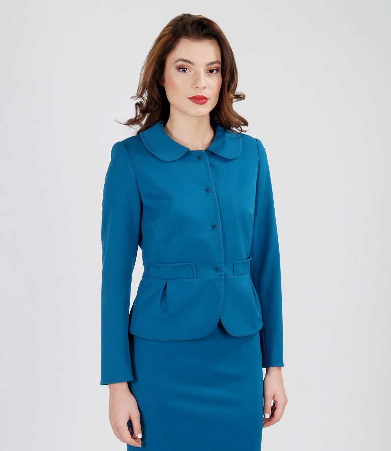 Jacket with rounded collar, cut in waist, with 2 flaps with creases and decorative stitching applied on collar termination, flaps and the back of the closing sistem. Closes on front with 4 hooks.