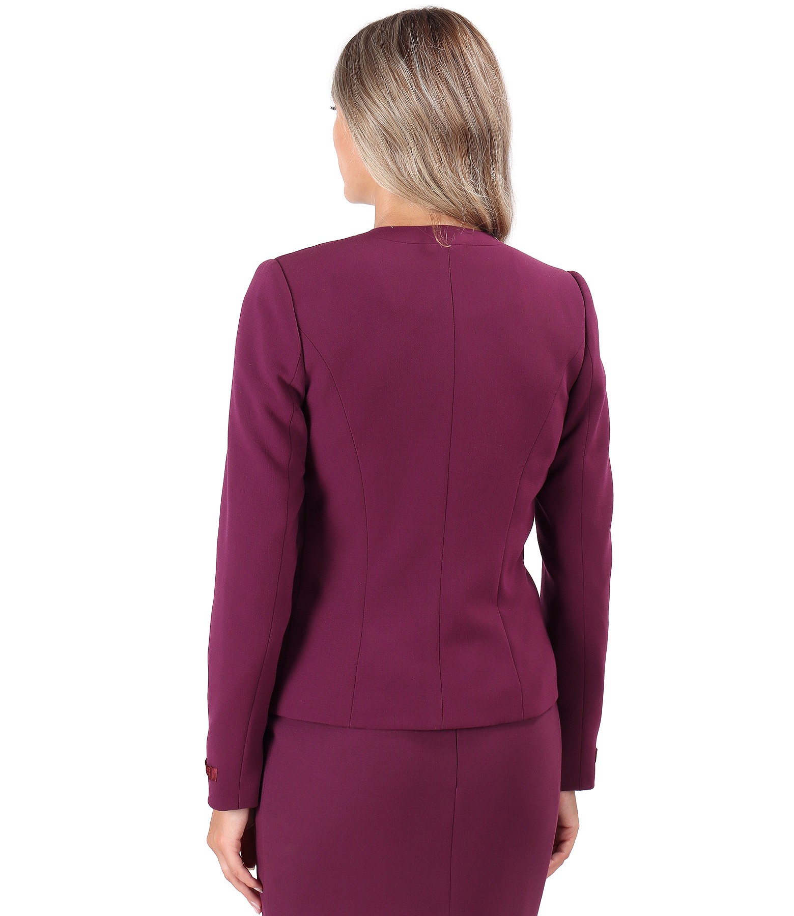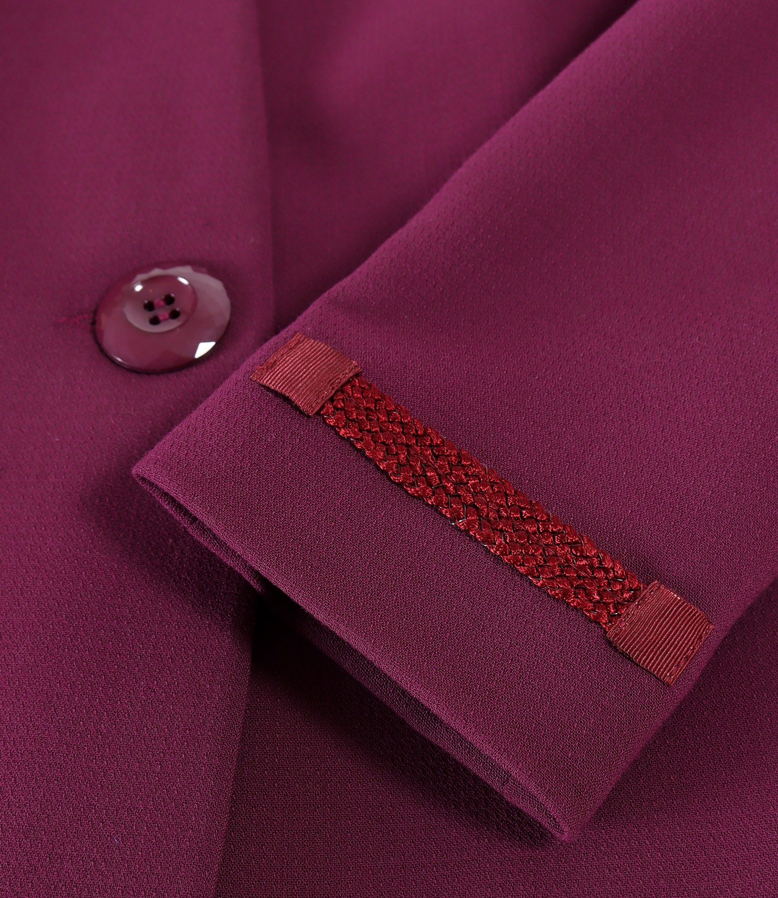 Elastic fabric jacket with trimmings at the ends, without a collar, and with deep decolletage. It closes with a button in the middle of the face.