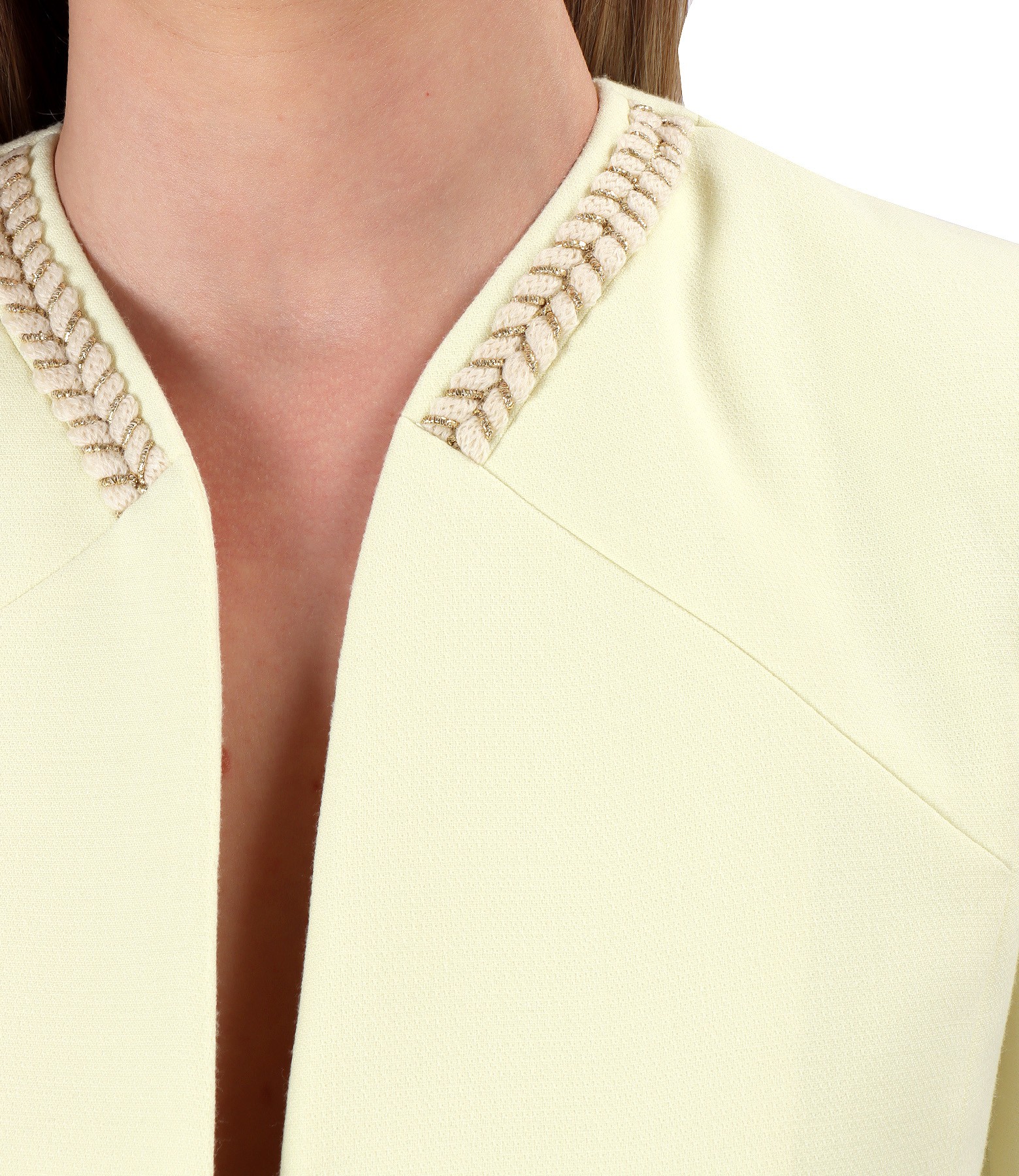 Elastic fabric jacket with trimmings at the ends, without a collar, and with deep decolletage. It closes with a button in the middle of the face.