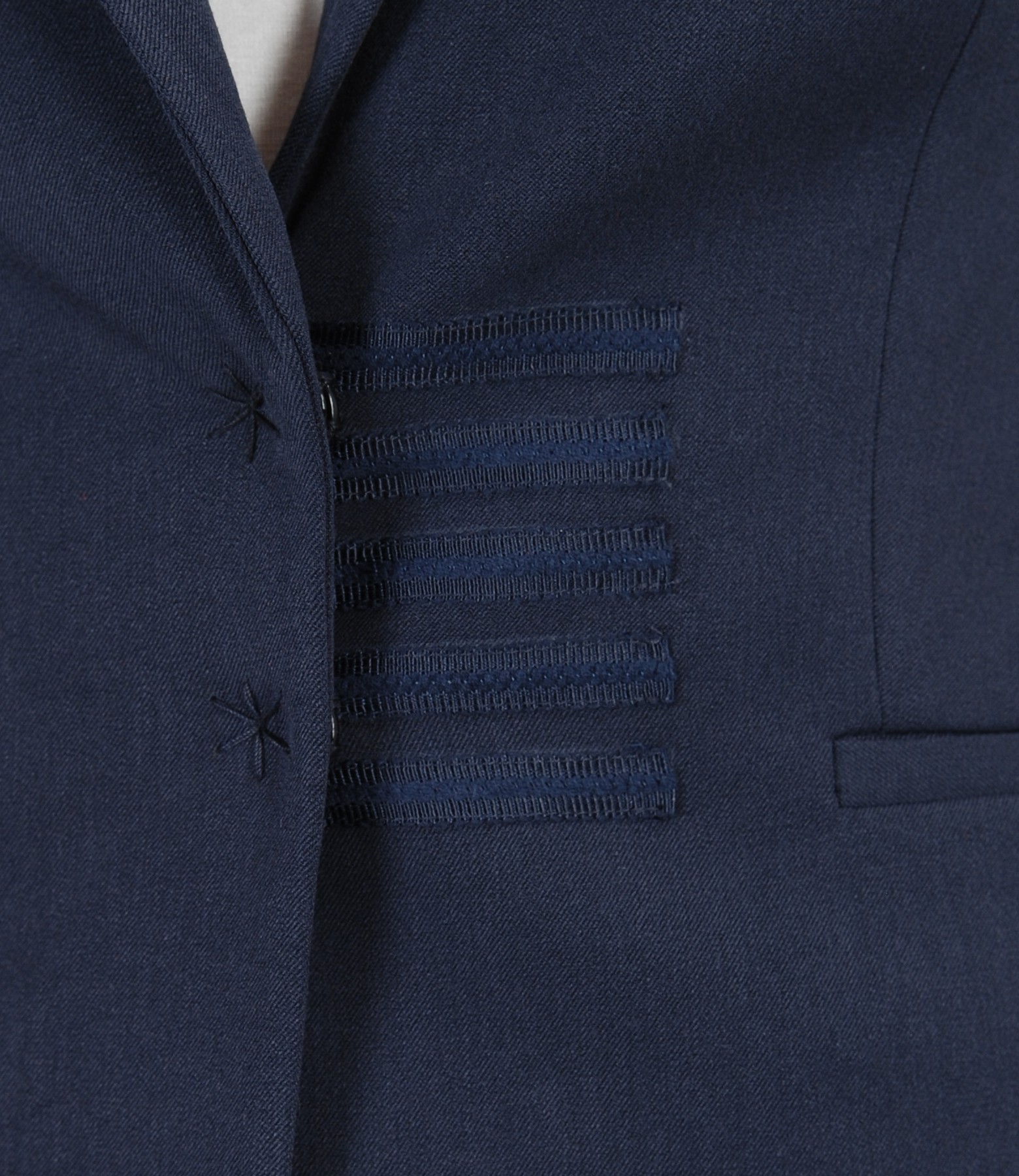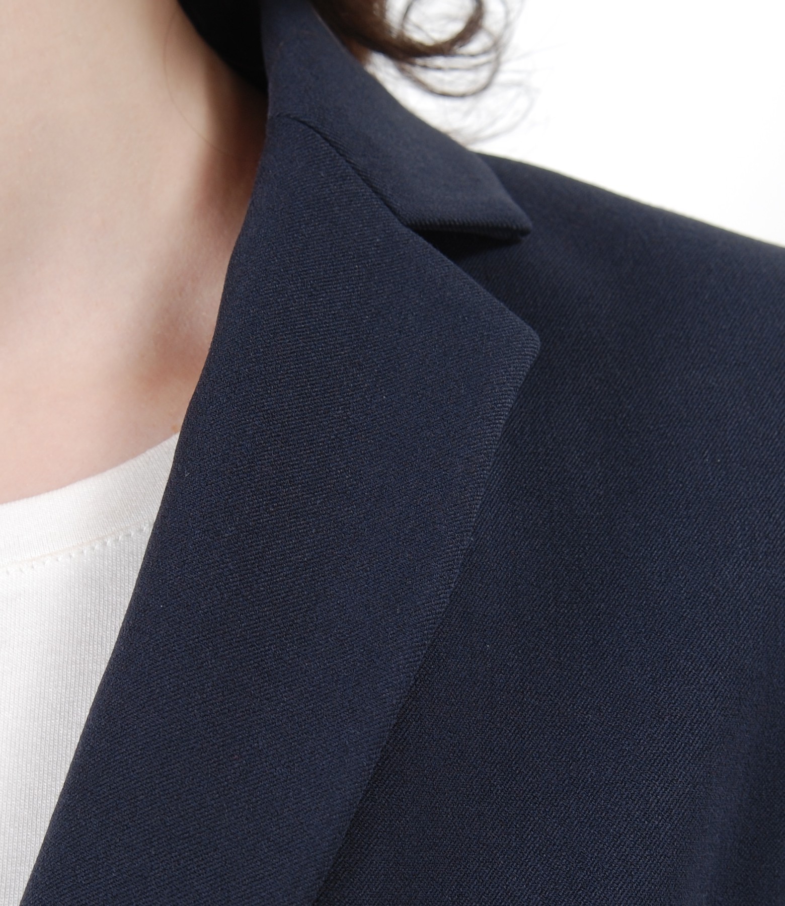 Elastic fabric office jacket, with deep decolletage, with welt pocket and attached waist and sleeves trim. Closes with 2 front staples.
